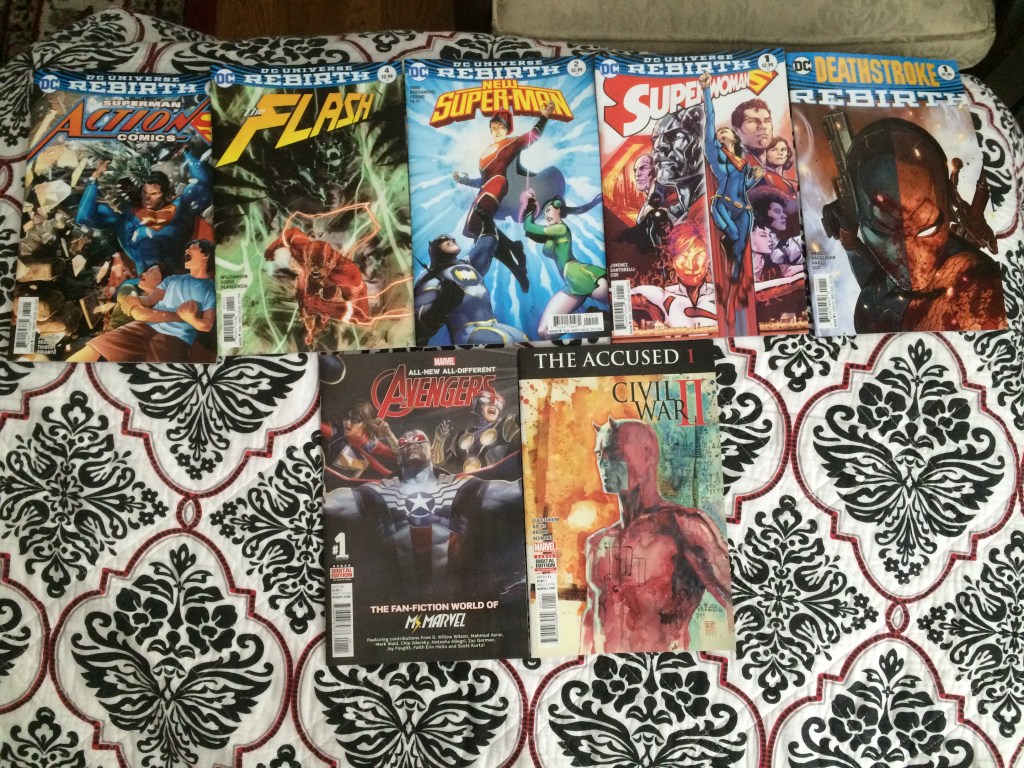 I was excited for this week’s issues because of Deathstroke #1. I’ve been a fan of Slade Wilson since I watched the Teen Titans cartoon, so I was intrigued to be able to read his comics. Of course there are old runs of Deathstroke, but I haven’t looked many up since I knew a bit about his story already. Also, at the time that that Daredevil issue came out, Marvel had a deal with a certain retainer where they printed certain covers onto tee-shirts. The deal stopped long ago, but it was fun while it lasted. I have a shirt of this Daredevil cover and one of a Scarlett Witch cover (though the printing on that shirt was damaged by the washer or dryer >__<). I’ll point out that cover when I get to it.