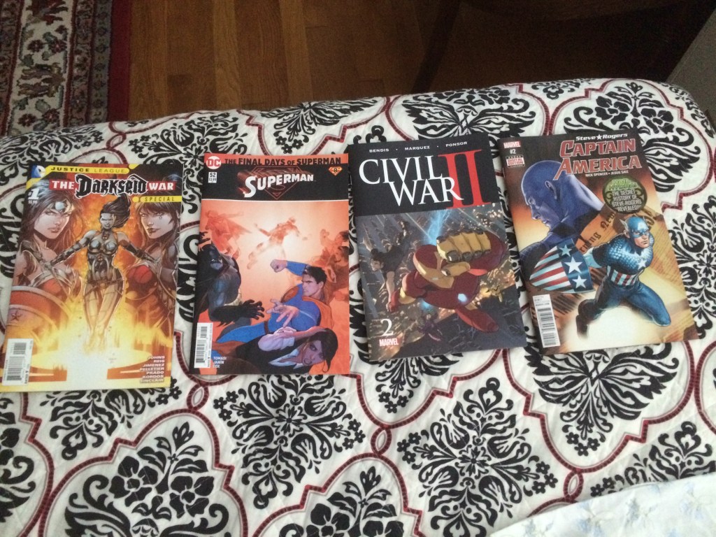 Originally, my comment on this said that this was my comic haul. Eventually I tagged these as comic book hauls. But it’s hilarious that four comics (or even a dozen) were a lot at one time. Nowadays, I get many many more (even without me picking them up ever two weeks, if I go back to weekly when pandemic stuff hopefully goes away). I remember this was exciting because DC was ending the New 52 era and I was ecstatic about that (as most were). And Marvel was going through dramatic times as Capt was having a lot going on in his issues, oh and the whole Civil War II event also, sure, haha.