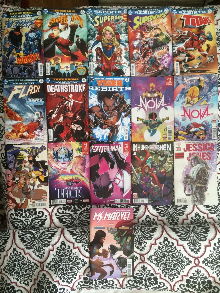 The short-lived Vixen Rebirth title, Richard Rider Nova returned (after being presumed dead after the events of Annihilation) to team up with the current Nova (Sam), Squirrel Girl’s 25th Anniversary issue, the new Thor was taking off even though the mystery of who she was was still in question, and Miles Morales and Spider-Gwen (Ghost-Spider in the future) were hitting it off, this was a crossover between their books. Oh, and this was the time that I started picking up the Ms. Marvel issues as well as the volumes.