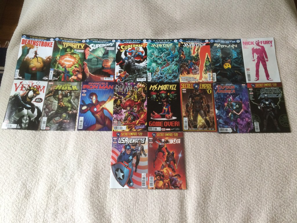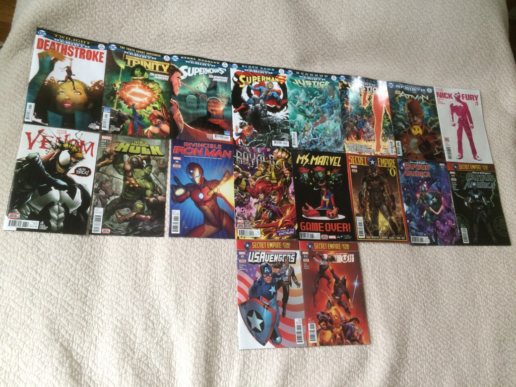 I couldn’t get the lighting correct for this photo so I just posted two. This was the week Venom got a new run, Nick Fry got a very colorful retro comic, and the beginnings of Secret Empire appeared. Hydra was having a grand old time. XD