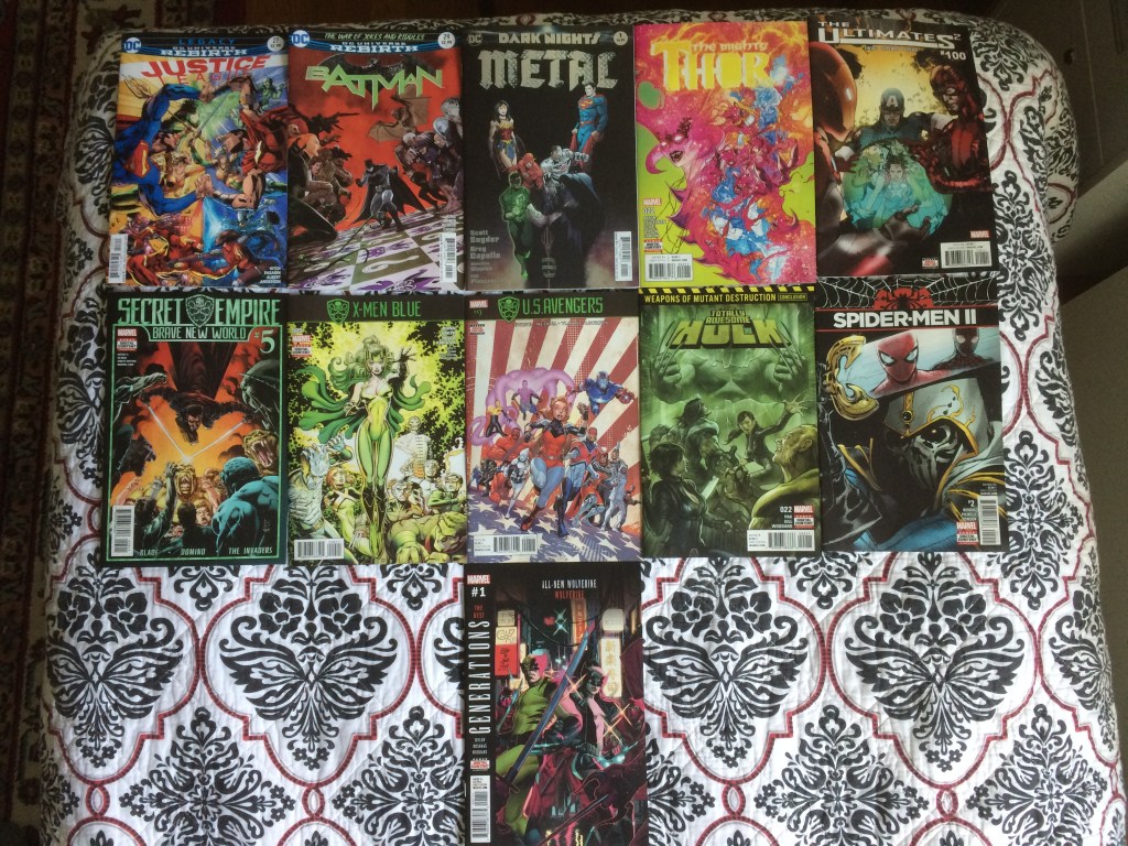 Secret Empire chugging away, the final WOMD issue, The Queen of Cinders shows up in Thor (this was prepping for War of the Realms I think), Wolverine’s Generations issue, and the 100th issue of Ultimates (when a title has many runs under its name, the title keeps a Legacy number, so this was celebrating 100 issues of any comics that have been titled The Ultimates), and of course the beginning of Dark Knights Metal (what a long and crazy road this plot had yet to come!).
