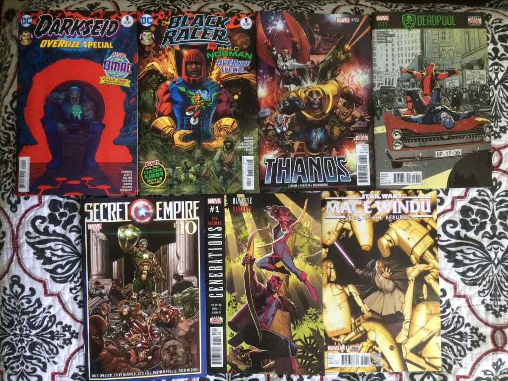 A couple DC specials, the last main issue of Secret Empire, the Hawkeye Generations issue, and Thanos 10 I apparently captioned that he was an Avenger or something? I can’t remember haha. Oh and of course that Mace Windu miniseries began ^^