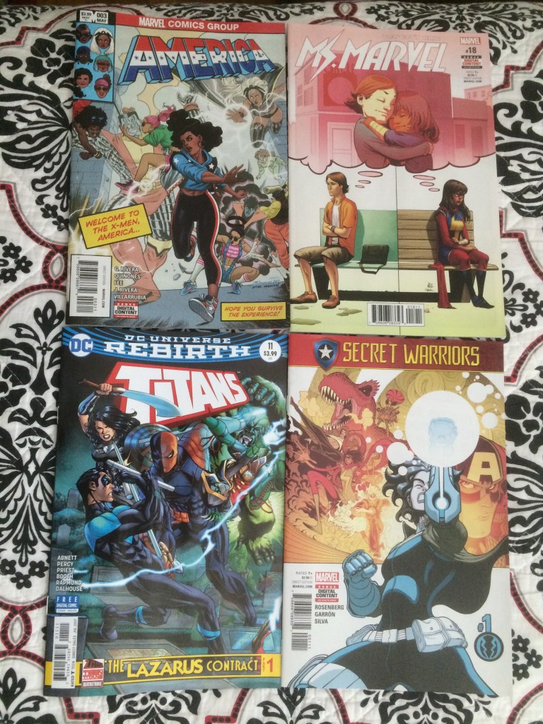 Not too much that week, but America traveled to a classic X-Men time and Bruno and Kamala were having troubles. Secret Warriors debuted again and it was a great run. Some fun panels from this run are on my IG haha. And Titans dove into the Lazarus Contract event. That was an intense event.