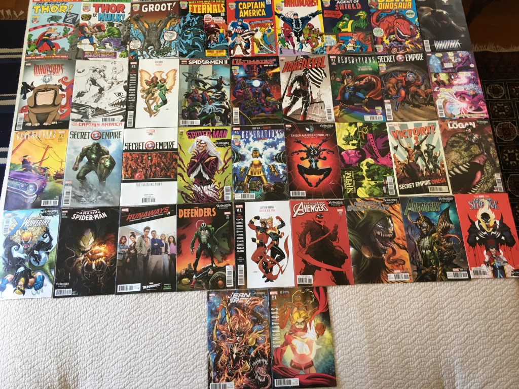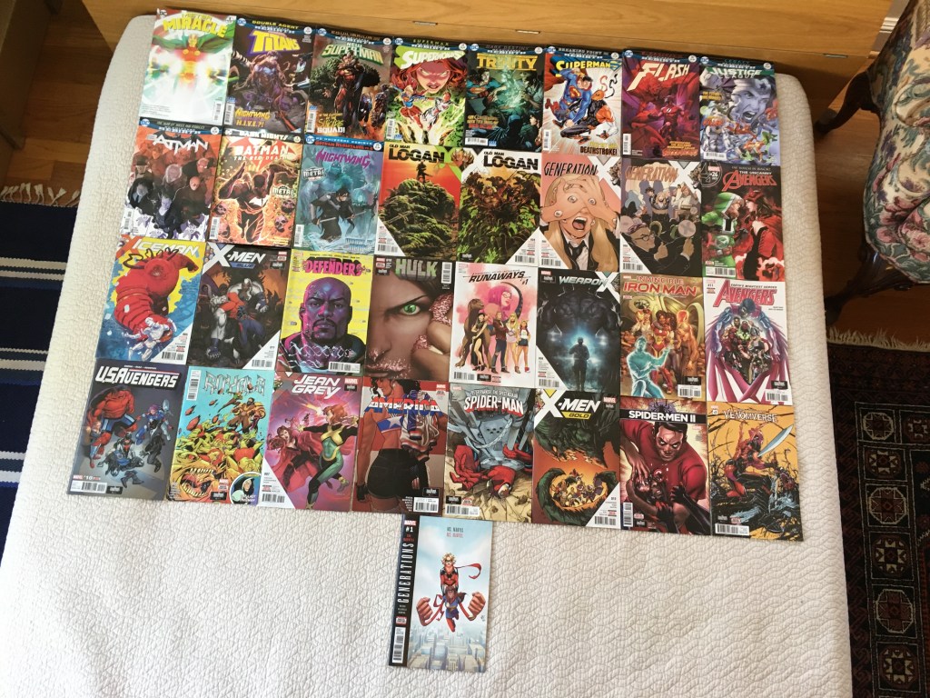 The first 2 images are of allll the variant covers from the previous few months that had been in my box, and various specials and issue I could wait for. The last photo are the issues I would actually read from the first images and the NCBD (New Comic Book Day) comics of that week. This was the week that The Runaways returned with an ongoing series. The original run is classic, this run and the one that happened afterward it were also great. 89 comics XD