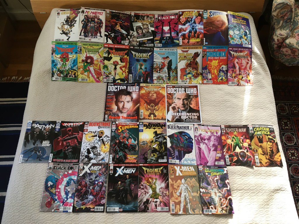 From the top down to the two Doctor Who Magazine issues are older stuff, normal Legacy covers, and True Believer’s Phoenix issues. And the bottom two rows are that day’s issues. ^__^. Fun stuff, crazy stuff, The new Bat-family character The Signal had recently arrived, Jean somehow somewhere doing things and Adam Warlock’s return during the Infinity Quest Guardians event.