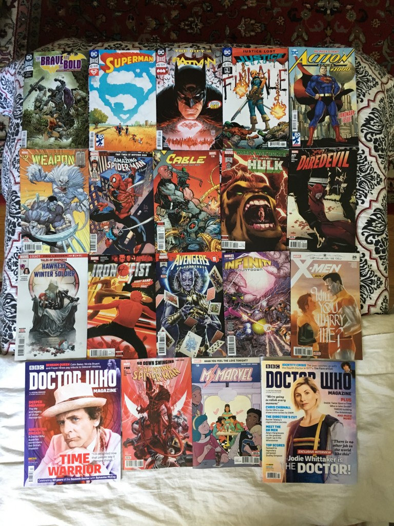 The Gift had started, Action Comics #1000 came out (I got one of all the covers my store had, and 3 days later I bought one copy of the main cover for one of the podcast hosts for the DC comics podcast that I watched since he had a restaurant opening a location around he corner from my store and was there for the opening), Weapon H had some Wendigo problems, Hulk was extra angry, No Surrender and Infinity Countdown were chugging along, a wedding was in the works for Kate and Piotr, enter the Red Goblin, and Kamala was enjoying her Red Dagger visiting Jersey City.