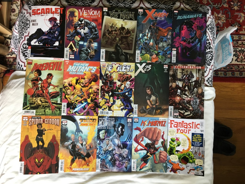 This week’s are the first image, great variants in the second. Venom comics extending the symbiote lore, Runaways dealing with drama, Extermination continues, and Spidergeddon stories in the multiverse.