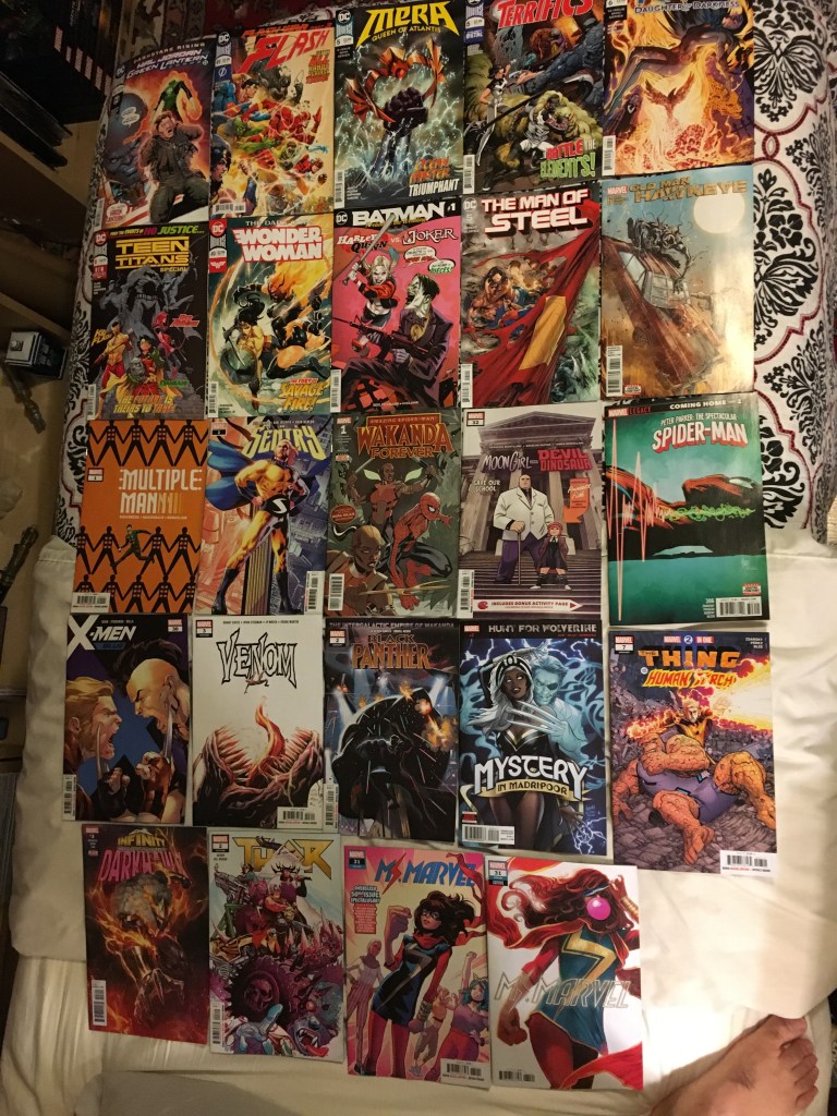 Another photo not posted (wow this happened wayyy more times than I thought!). Barry need some help, the Teen Titans dealt with what happened during No Justice, Harley was getting ready for the wedding in her own way, Multiple Man got his own title, Sentry got a new miniseries, Fisk got a little girl to be his daughter for publicity (if I remember correctly) in Moon Girl, Both these son’s of Logan were having problems, Wakandan Empire problems, and Kamala got her 50th issue.