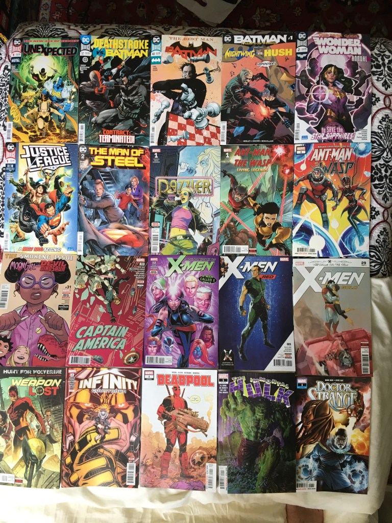 Another un-posted set of photos. Oh right, I forgot about The Unexpected title, Joker was causing havoc, Hush was causing havoc, a new era of the Justice League, Dazzler got a one-shot, Ant-Man (Scott) and the Wasp (Janet) got a one-shot, Moon girl tackles smoking, Deadpool started a new run, Immortal Hulk began (certainly the best run of Hulk I’ve read, it was 50 issues. We’ve just started the next creative team’s vision of Hulk as of a few issues ago), and Doctor Strange was finding new ways to do magic after magic earth magic took a huge hit and he couldn’t use magic he same way again so he had to journey to the stars. Second photo are just variants from past weeks.