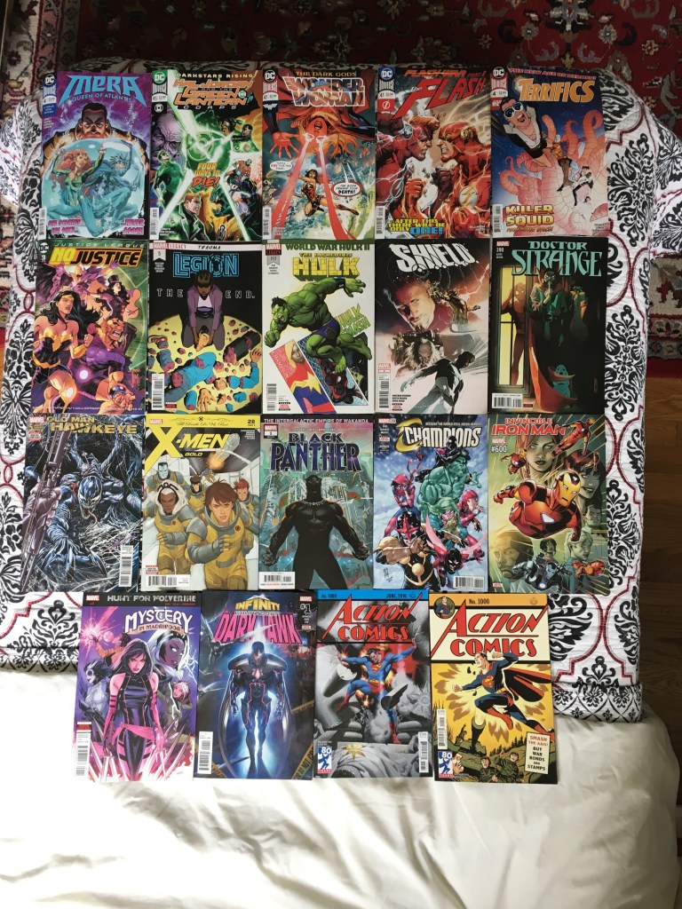 Mera continuing to deal with Atlantean drama, Darkstars still rising, Barry and Wally were at odds, No Justice continued, Stephen didn’t want to hang with Spidey, Black Panther started its Intergalactic Empire of Wakanda arc which lasted a VERY long time (it only ended a couple months ago), the Champions were cold and meeting a new hero (this was the start of them expanding their roster), Iron Man got his 600th issue, and more in the hunt for Wolverine story.
