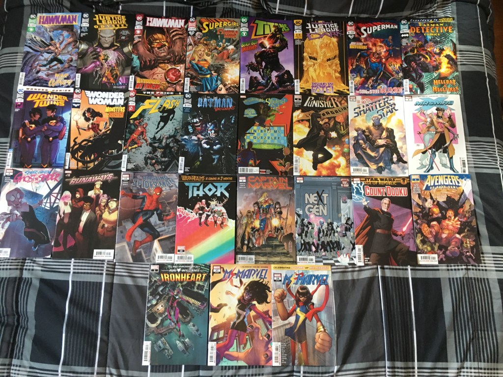 Hawkman vs the Deathbringers (that issue 3 was there because I had forgotten to get it when it came out and only noticed hen I was reading an issue an realized I’d missed one), Darkseid’s plans falling into place, Beast Boy hulks out, Jon Kent return properly and is a bit out of control, the Wonder Twins start as interns at the Hall of Justice in a new run for them, The rice continues with a character didn’t expect since I thought this was connected to something else entirely, Batman Who Laughs continues with his origin story, the Runaways rock some evil duds as they must pretend to be the evil offspring their parent had hoped they’d become, Thor and Odin have bonding time, Captain Marvel’s arc this run was one of time and a future in a bubble that would eventually spawn a new villain for the Marvel universe, Next Gen started within the Age of X-Man, Dooku got a one-shot, Avengers No Road Home started (basically like a sequel event to No Surrender), Ironheart still figuring things out, and finally, Ms. Marvel had its 57th issue which both celebrated 5 years of Kamala, and the departure of G. Willow Wilson being on the creative team. I added that photo at the end to have her first and last issue of her co-created character’s book. There will be a post celebrating Ms. Marvel’s first 5 years later. I had a convention that weekend, so it took a while to get to arranging and taking the photos. The second photo is of variants.