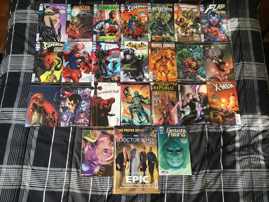 Selina was busy with things, the Otherkind made themselves known in JLD, Hawkman discovered a Kryptonian past incarnation of himself (as he was being bounced all over time and space in the minds of his past selves during this run), at this time, Superboy (Jon Kent) had aged up after having a lot happen to him over lost years, Flash met the Sage Force avatar, we met the Grim Knight in Batman Who Laughs next issue, Kid Loki was scheming in Asgardians of the Galaxy, The Age of the Republic got its one-shot, Black Widow got a new run, X-Man was doing crazy stuff in Uncanny X-Men (getting ready for an event), Riri was getting used to her new suit, and Doom was getting an upgrade.