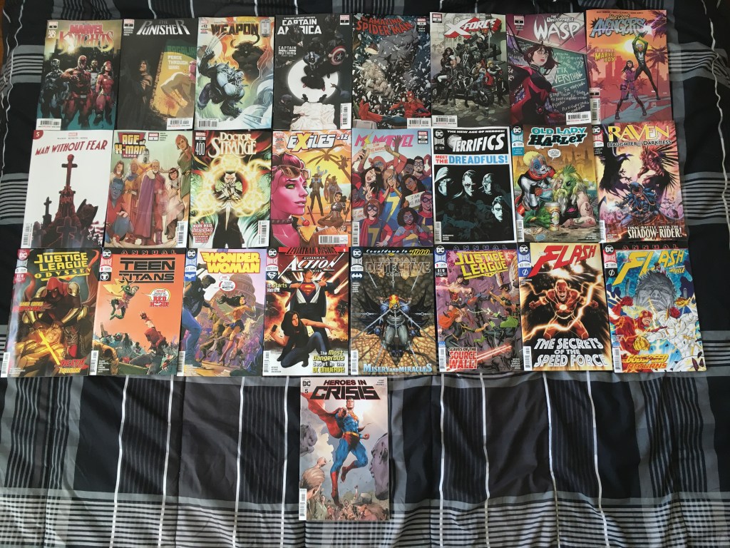 Frank hunting Zemo in Bagalia, Capt in trouble with the law, Unstoppable Wasp dealt with something very real in this arc and I love that they went there, Marvel Boy returns in West Coast Avengers, the Age of X-Man began (this is the big even right before the Age of Krakoa, a familiar situation had unfolded), Doctor Strange got his 400th issue, Exiles got a little break, Kamala felt the love from her friends and community, Raven was having a time, Damian and Red Hood had issues, Diana was traveling with creature of myth and had to bring them to the city, Leviathan had started to rise in Action Comics, the Justice League were at the Source Wall, Flash learned more about the other Forces, and things were still being questioned in Heroes in Crisis.