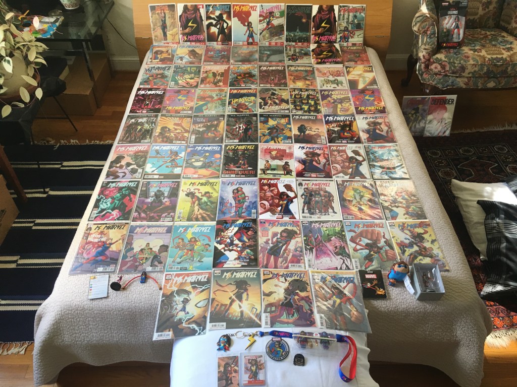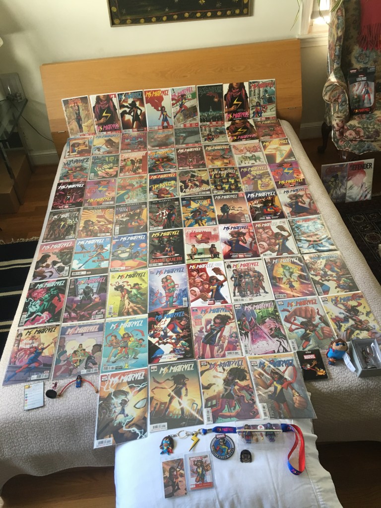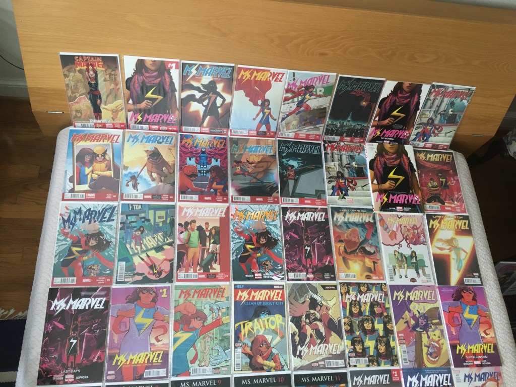 I’m a bit late on this post but it’s been a convention weekend. Here they are. I’m only missing the other hardcovers.Thank you all for all of this utter magic. Kamala Khan’s been amazing through you all Ms. Marvel had me at Page 1. From here to here. In these 5 years, I have enjoyed watching Kamala grow and change and understand herself and the world around her more and more. She has become a leader and has begun to truly understand how her powers work. Issue 38 was lovely. I enjoyed all Ms. Marvel’s guest artists. And I am excited to see what is to come from Saladin Ahmed and Minkyu Jung. Also, in the first photos: I added Captain Marvel 14, then the mostly official Ms. Marvel merch below all the issues and also in the top right corner. Again, thank you all.