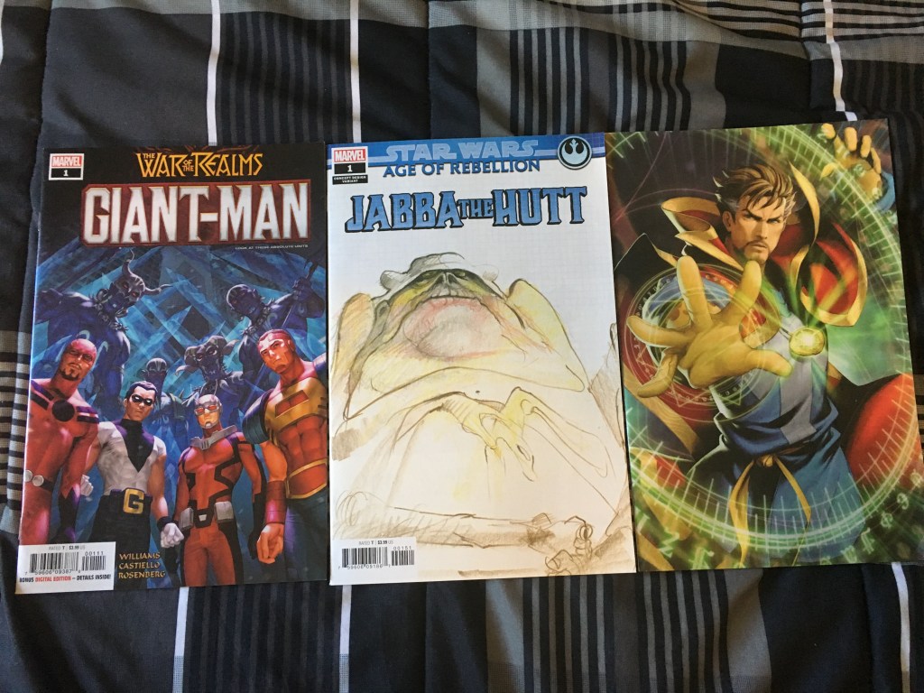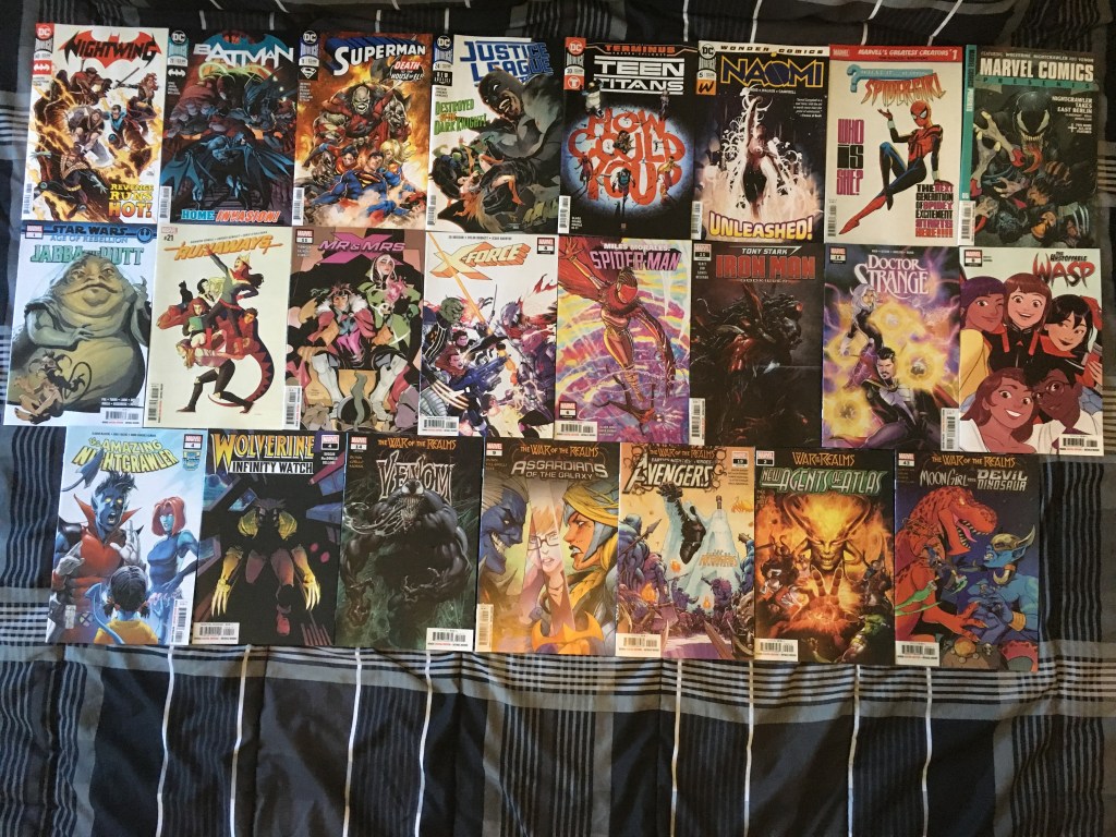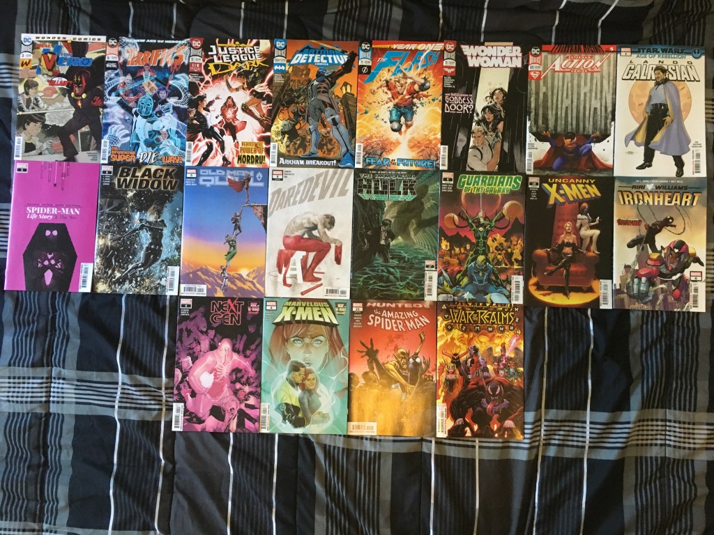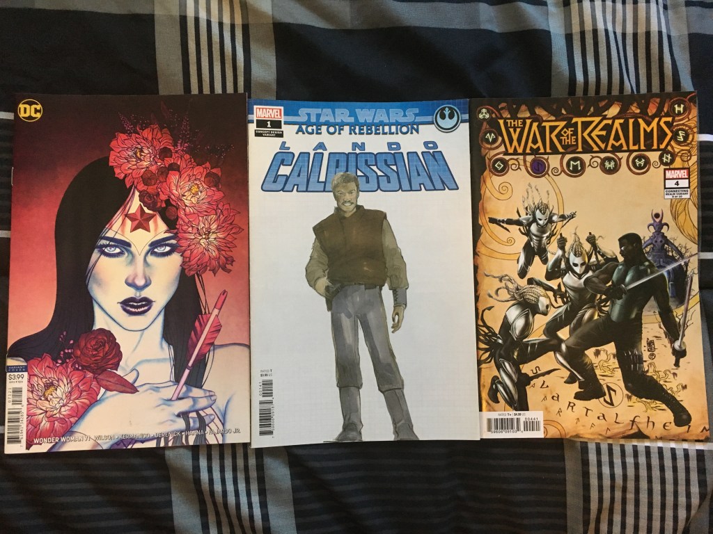 Miguel and H-Dial continue to have villain problems (and I suppose hero problems too), the Terrifics JLD and Batman were having bad times, Clark continued to deal with the mysterious threat of Leviathan, Lando got a one-shot, OM Quill has some Shi’ar problems, while in present day the Guardians were having (literal) Hela problems; Miles and Riri had an adventure, secrets were being hidedn and revealed in AOX, while in The Hunted, Peter was in a horror movie, and War of the Realms continued the burn everything. (Keep in mind that printing delays and other such disturbances make it so some events can’t end eve if they should have by a certain time before others start, so WOTR’s is happening after most of these other stories have ended other than the X-Men stuff). Variants in image two.