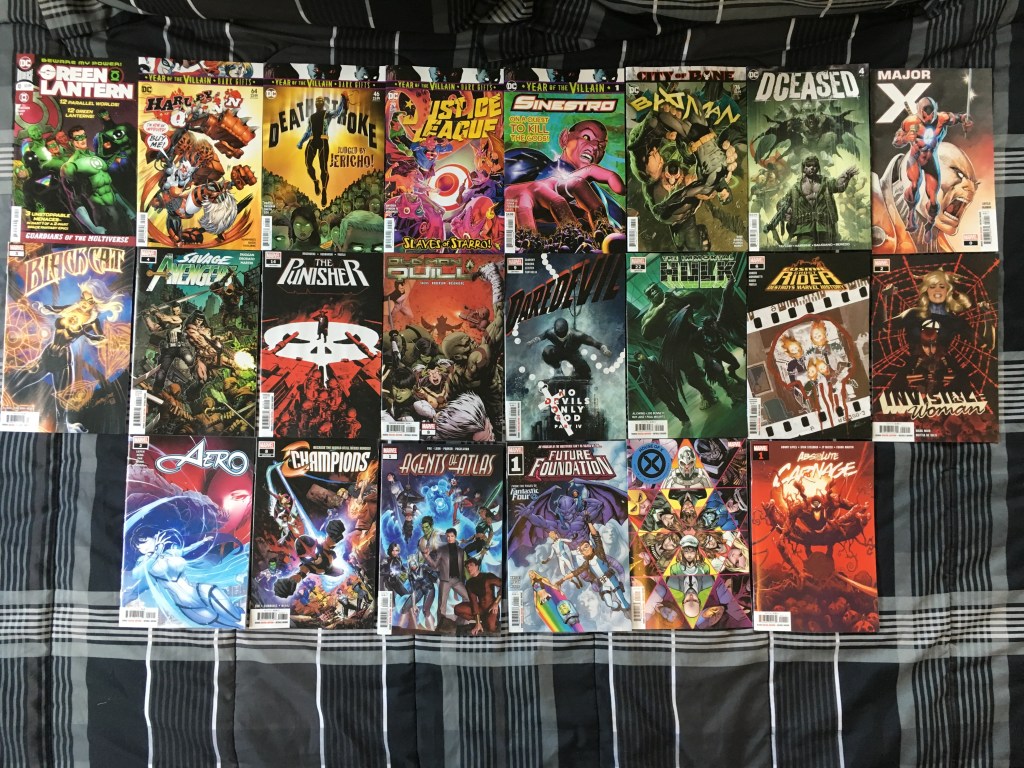 There were multiversal Green Lantern adventures with Hal, Harley got some upgrades (from Lex I think she accepted his offer for a bit), Jericho came for his father, the Justice League had some Starro issues, Sinestro was using his new Lantern powers, Bane goes for Batman again trying to repeat his previous record of breaking Bruce’s back, Black Cat has some magical fun, Matt is trying not to be Daredevil, Cosmic Ghost Rider visits his past self in Frank’s past, Susan was in Natasha’s cross-hairs, Aero was learning about her powers, Sam was a black helmet Nova, Agents of Atlas got a new run, the Future Foundation got a new run (other than Sue, Reed and their kids, the Future Foundation was with them), House of X issue 2 dropped and Absolute Carnage’s debut happened.