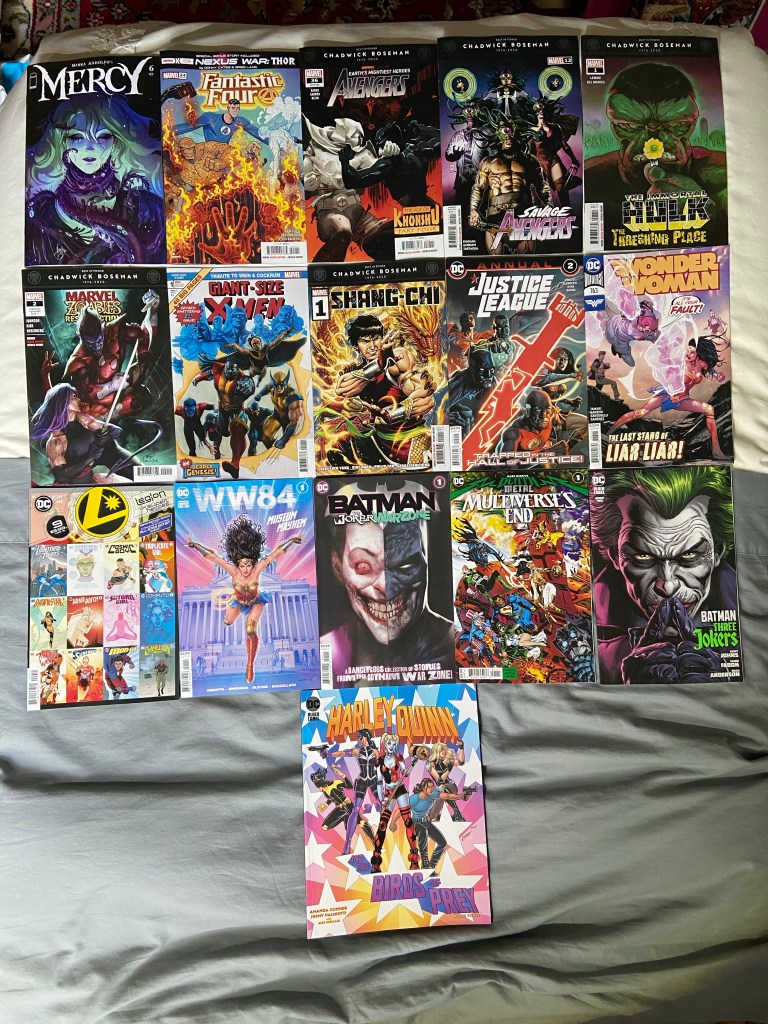 The FF had a visit from Iceman (Johnny was not amused), the Age of Khonshu still held, the Savage Avengers met Shuma Gorath in a way, Hulk got another special, a classic Giant-size X-Men got a reprinting (but with each page or every other page by a different artist recreating the pages from that issue), Shang-Chi got a new run (to help to promote the movie), the Justice League had a murder mystery to solve, Diana was still dealing with Liar Liar, LoSH got special issue with each page being designed by a different artist (each page was amazing, but a few caught my eye, they’re on my comic panels IG), Wonder Woman 1984 got a tie-in one-shot for the movie, we got a Joker War special, there was a DKDM special called Multiverse’s End (the characters from “Multiversity” had to deal with the Multiverse ending as best as they could), issue 2 of Three Jokers came out, and the penultimate issue of Harley and the Birds of Prey came out.