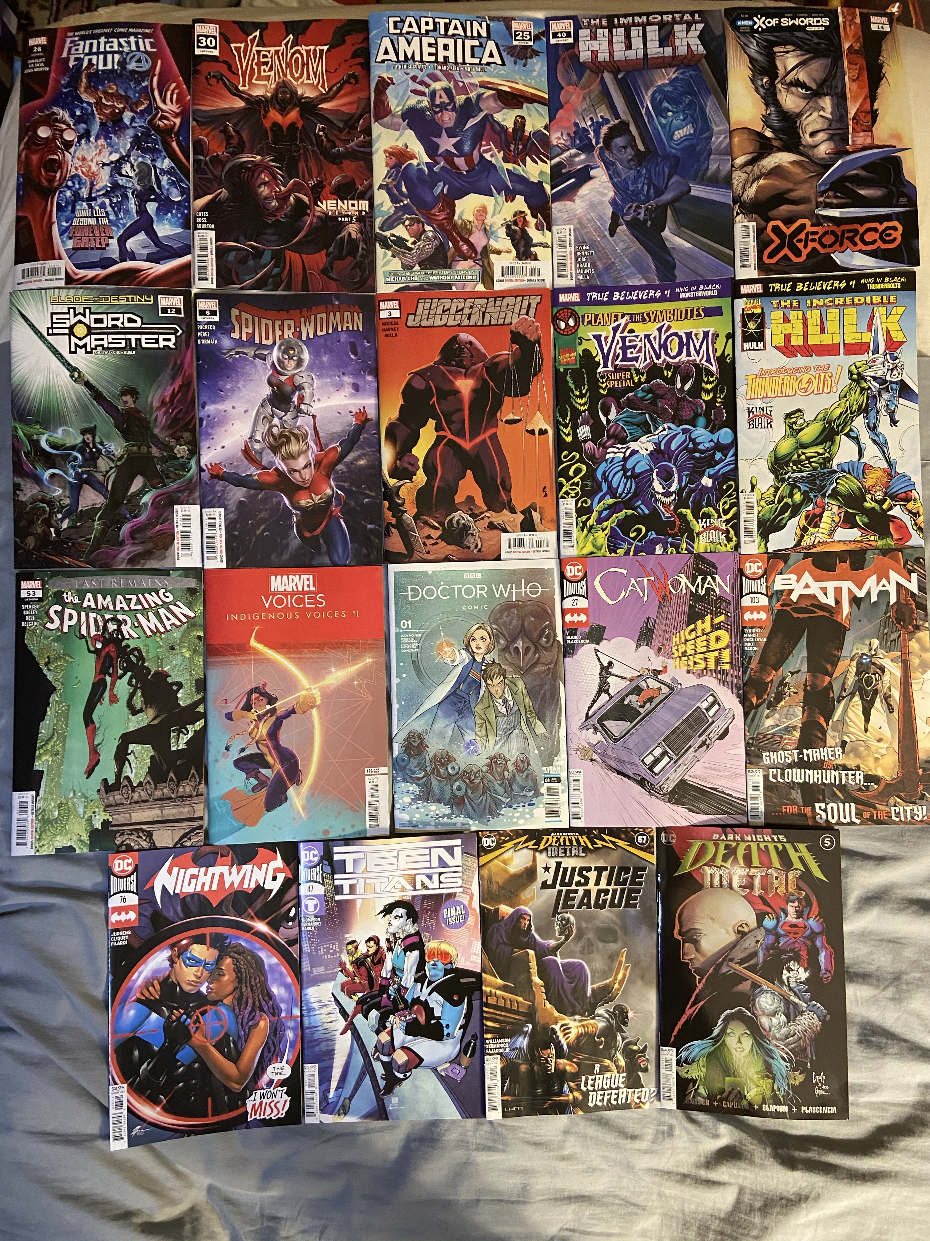 The FF had created and opened the Forever Gate, now other dimensional refugees were running to safety, Venom’s time on this earth was ending, this Capt run reached issue 25, Joe Fix-it was in charge in Hulk, Sword Master had its final issue, Jessica Drew had a lead but it was in space, Juggernaut was on trial, we got a TB’s about the planet of the symbiotes, Peter was still at the absolute mercy of Kindred, Marvel Vocies had its Indigenous Voices issue, Doctor Who started a new run, Batman had to stop Ghost-maker from making a ghost out of Clownhunter, KGBeast took another shot at Nightwing, Teen Titans had its last issue, the Legion of Doom was saved by the JL (turned out great…), and the penultimate issue of Death Metal dropped.