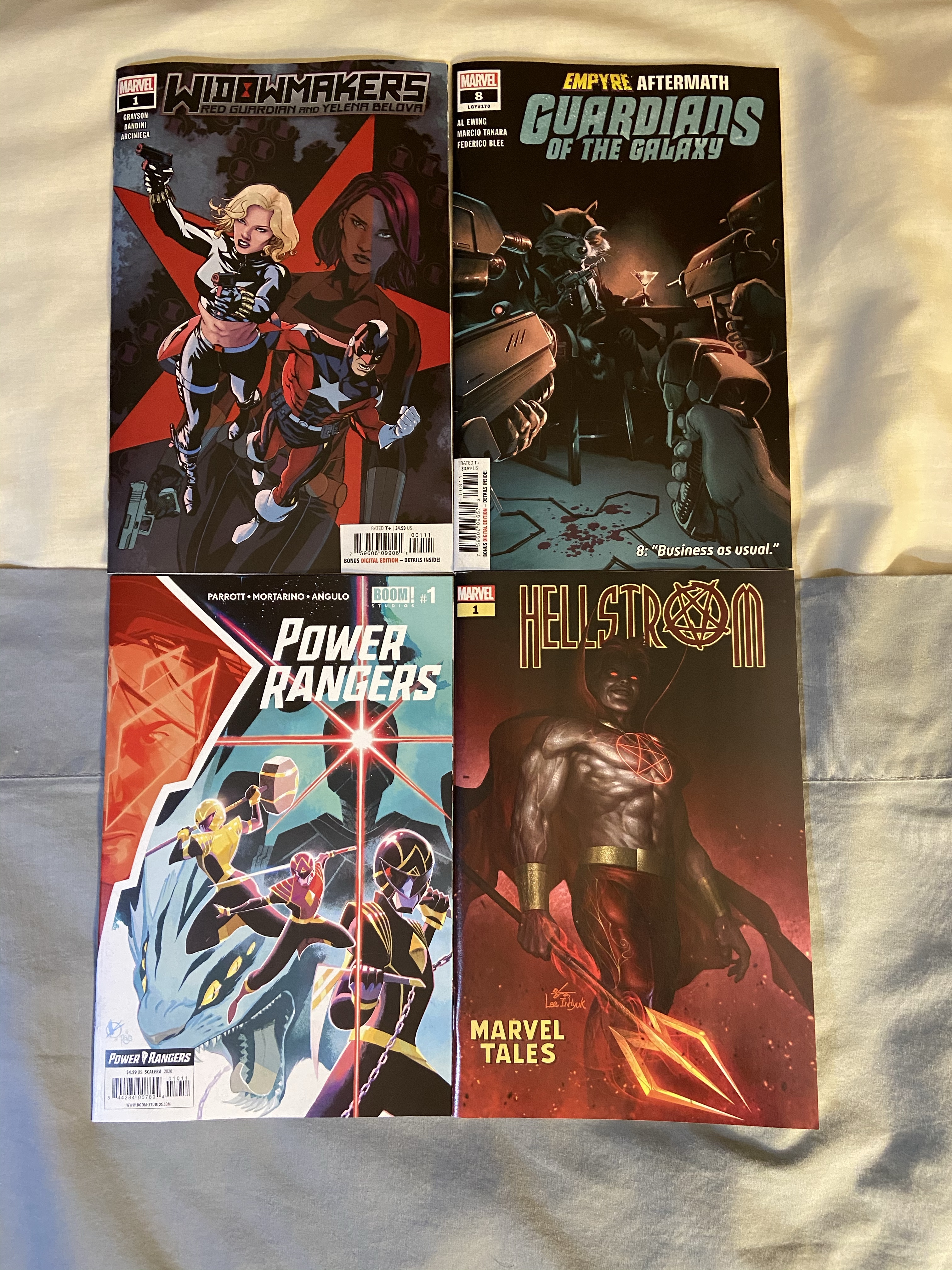 Late issues. Widowmakers was from November 18, Guardians was from November 4, Power Rangers was from November 11, and Marvel Tales: Hellstrom was from November 4.