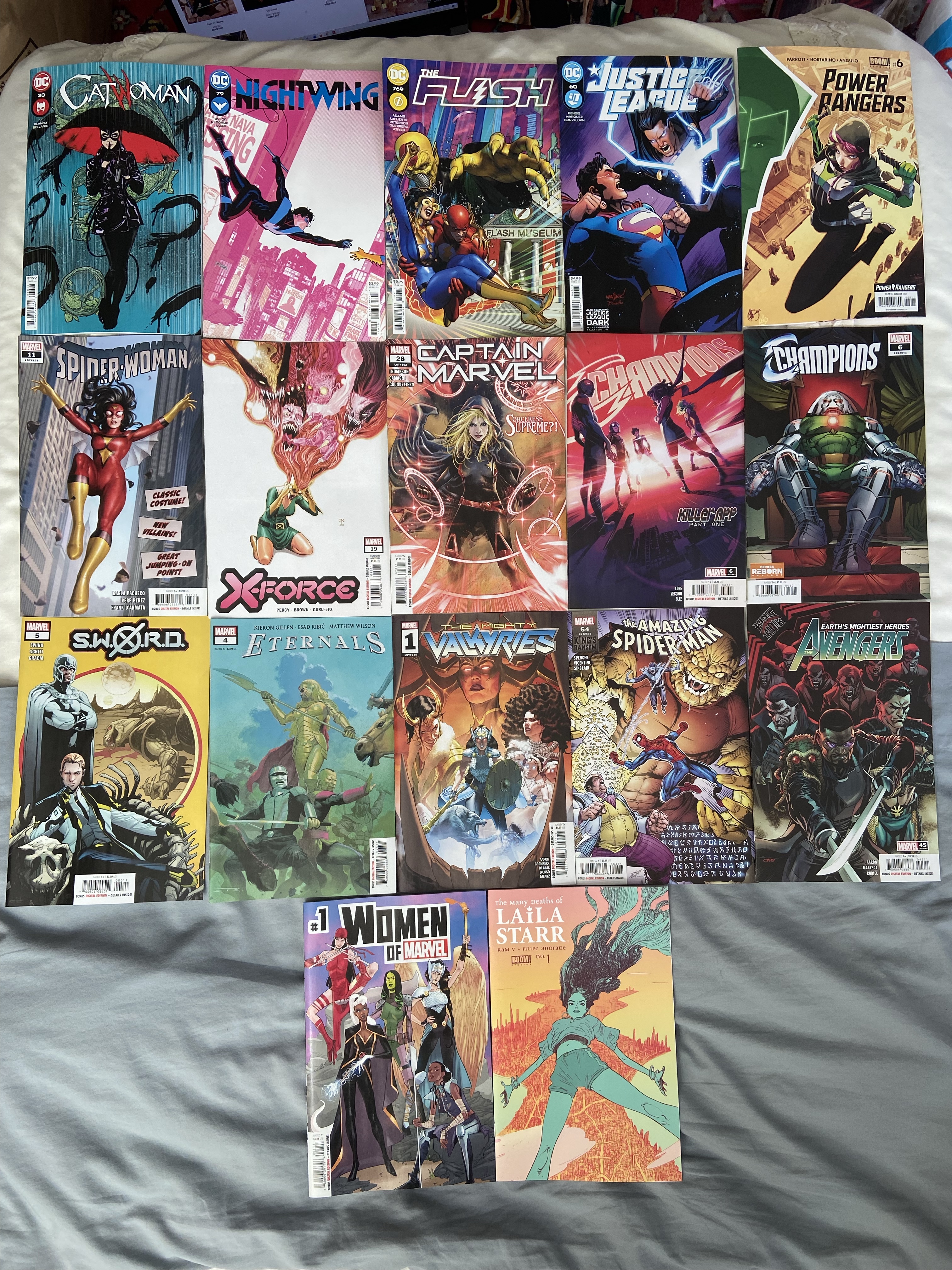 Dick Grayson made a big decision about what to do with the inheritance he got from Alfred, he got a puppy and Blockbuster was making moves, Black Adam joining the JL caused some growing pains, Jessica Drew got her classic costume back after what the other costume was really doing, Krakoan residents were under mental attack, Carol asked Stephen to just teach her magic (if I remember correctly, he literally laughs), Champions started a new arc about some funky technology from a dubious company, Eternals had drama, Hela and Karnilla drama in the new run for Mighty Valkyries, Fisk drama in Spidey, we got the Women of Marvel special, and I liked the cover and story of Laila Starr, so I got the first issue here (then got all the rest as they came, since it was great!)