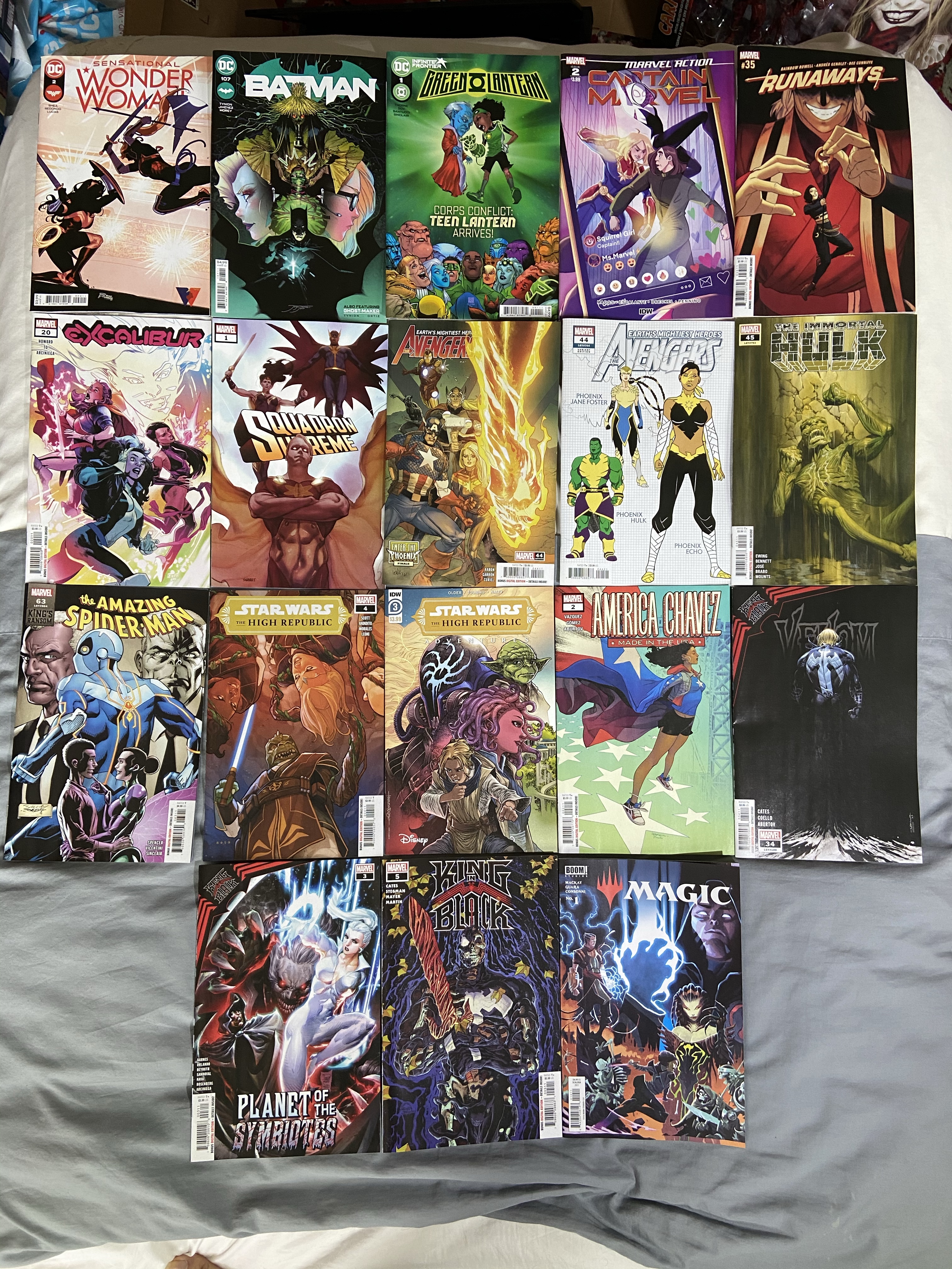 The Unsanity Collective made itself known, and Fear State was brewing, Teen Lantern (from Young Justice) went to Oa (there was drama), Nico had problems with her staff, Phoenix had chosen its new host, Hulk was de-powered, Tombstone’s daughter and Robbie Robertson’s son were dating (their father’s found out), America Chavez was starting to find out that family history wasn’t exactly what she thought it was, this Venom issue was the last issue before issue 200, a lot was going on, KIB 5 dropped, and Magic: The Gathering trading card game got BOOM! to make a comic series (the story has been fun and the cover art has been great!).