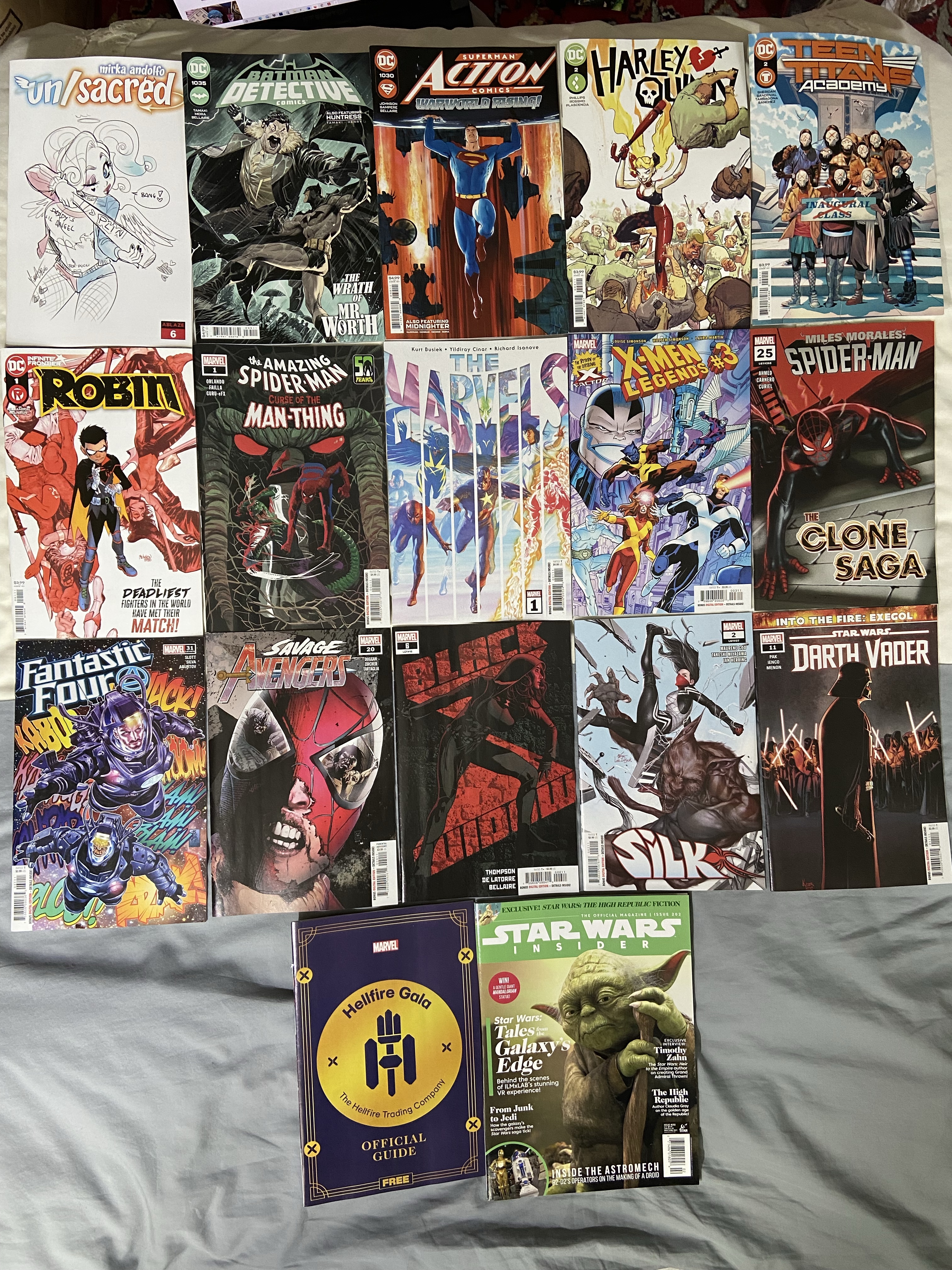 Mr. Worth was quite a crazy Batman character XD, the Warworld story in AC was beginning, the TT Academy was having problems on day one, Damian got a title all his own where he participated in a very deadly tournament (that arc ended recently), the 50th Anniversary of Man-Thing continued with another special, Miles got his own Clone Saga arc, Reed and Ben went exploring through the Forever Gate and found quite an expressive place, Silk was busy with a cat demon, Vader landed on Exegol, we got the guide for the first Krakoan Hellfire Gala (the second one is happening soon), and the next SW Insider.