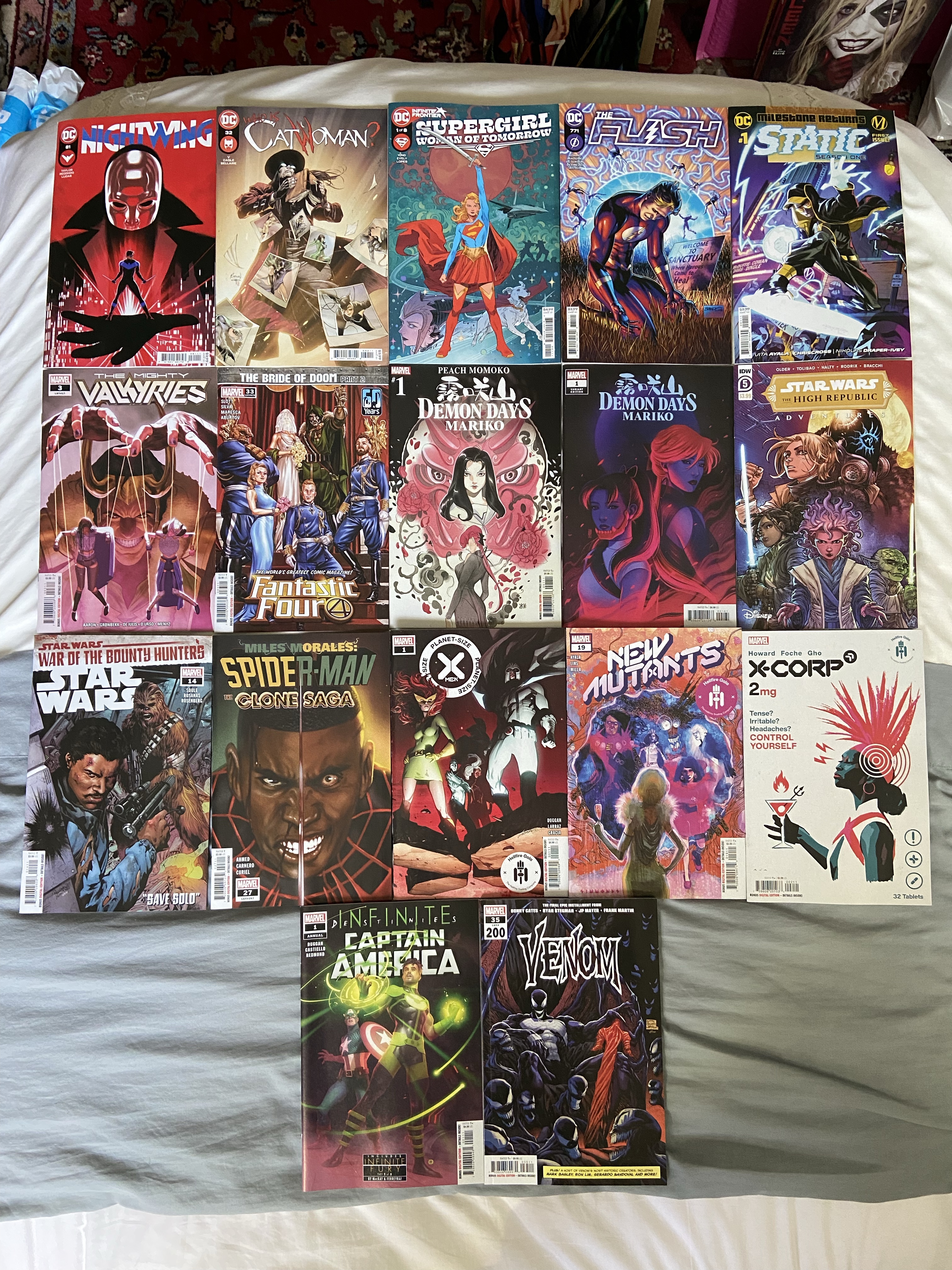 Nightwing still had a Heartless problem, Selina had a very successful bounty hunter after her, Supergirl got a run spinning out of her Future State story (though this was set hundreds of years before that FS story. This ended recently and it was such a unique story, I enjoyed it a lot), Wally was still blasting through time and unfortunately for him, he wound up back at the site of the Sanctuary disaster, Static got a new run out of Milestone’s comeback, Loki was having a time in the Mighty Valkyries, Doom’s wedding was upon us and everyone was invited (which meant A LOT of drama. Never mind what was to come.), the next issue of Peach Momoko’s X-story dropped, WOTBH continued, the origin behind the clones were revealed to Miles, the Hellfire Gala continued (as printing was still out of order, Planet-size X-Men really came out a bit earlier than it should have. Also, this issue had a really important event occur that changed everything), X-corp debuted the week before and I didn’t realize that a mutant character I liked and hadn’t seen in a while was in it, so I didn’t get issue 1 right away (this was the corporate side of Krakoa that dealt with all the financials and business aspects of what the mutants had created), Infinite Destinies continued and Venom’s 200th issue dropped.