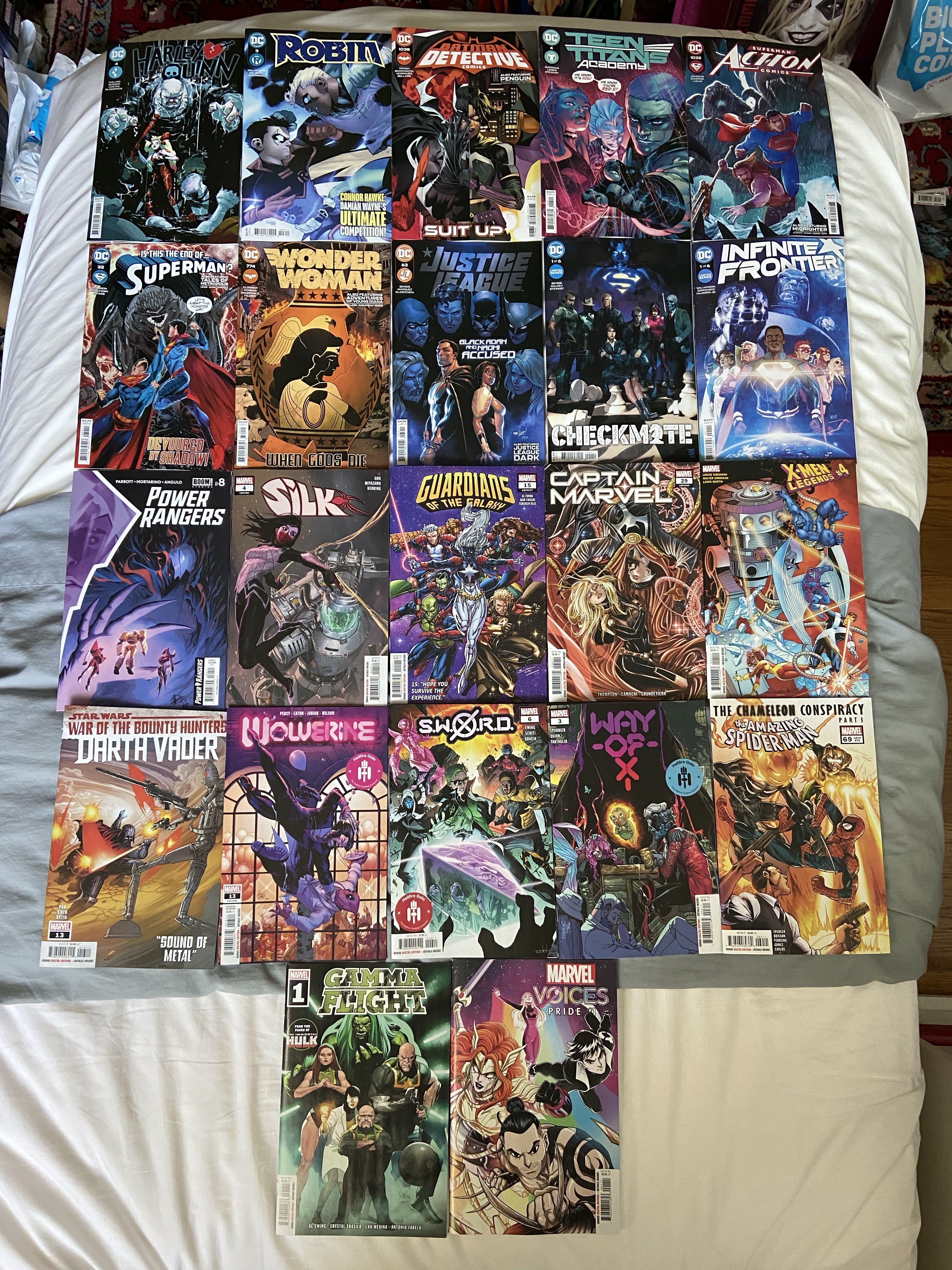 Grundy visited Harley, Damian and Conner Hawke got acquainted, the Bat-pack learned the new Red X’s identity, There was tension between Atlantis and the other countries with Warworld looming, Clark and Jon were dealing with shadow creatures, Diana got back to Olympus only to find it in ruins and the gods slain, Checkmate got a new run spinning out of the Leviathan event (all the world’s greatest detectives worked together in secret), the Infinite Frontier miniseries started (this series would lead to the next big event for DC which is starting very soon. Darkseid was making his move after being hidden from everyone since the end of DKDM when he killed The Quintessence. A group of powerful beings in the DC universe, including Hera, Highfather, Ganthet, Phantom Stranger, Spectre, and The Wizard.), The new Guardians configuration continued to move forward, Carol and Stephen’s fling continued, Vader and IG-88 had conflict, Deadpool tried to crash the Gala, a new run of Gamma Flight spun out of Immortal Hulk, and Marvel Voices released their Pride special.