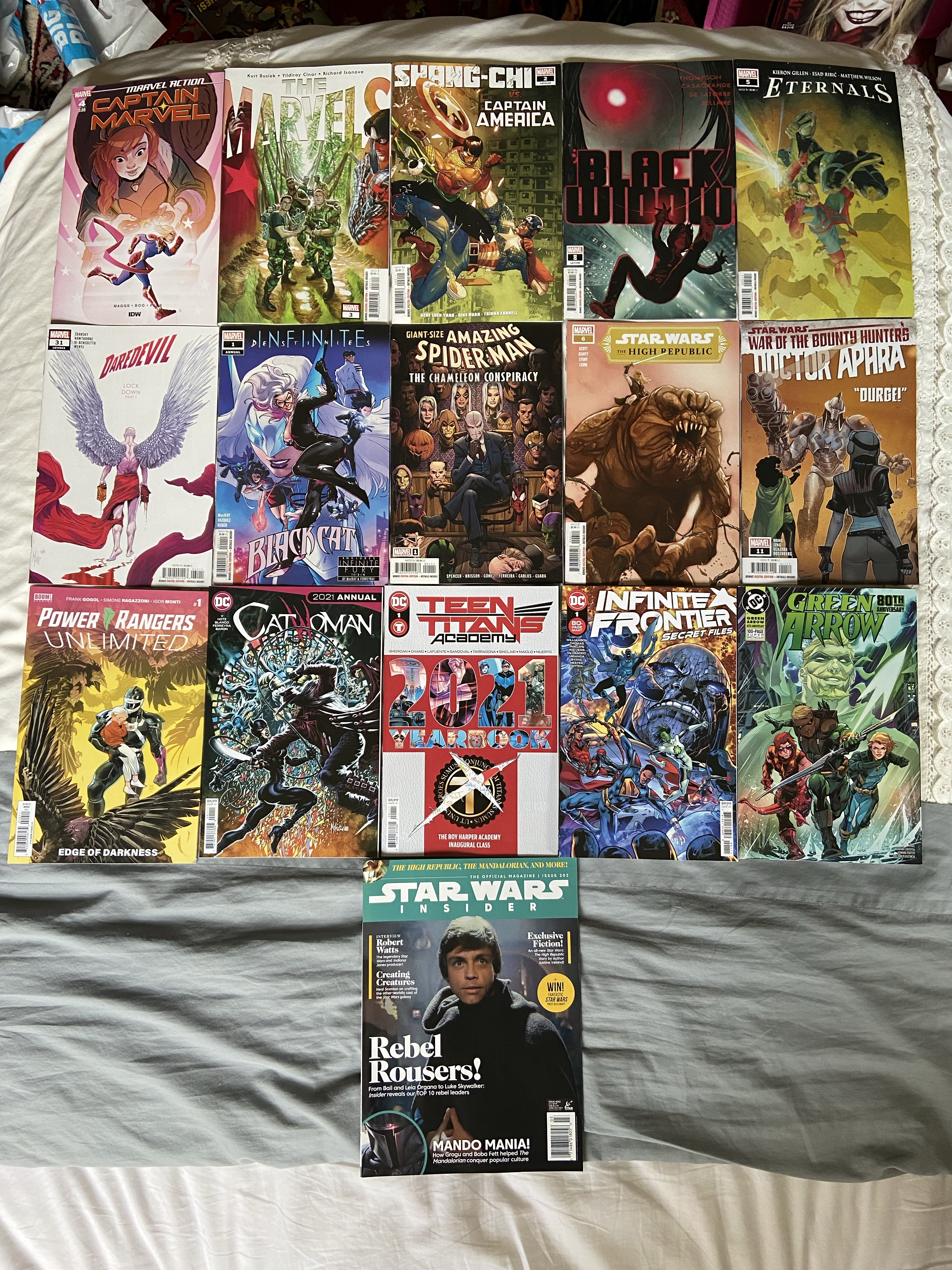 Capt wa unsure of Shang-Chi’s intentions (as were other heroes), the Eternals still were dealing with Thanos before it was too late (spoilers, too late happened), there was a lot going on in Daredevil, Black Cat got an Infinite Destinies issue (though this was the last issue but the some of the previous issues hadn’t even come out yet, so I had to wait a couple months before getting to this), we got the Chameleon Conspiracy ending which would change things, Durge the bounty hunter (from the original Star Wars: Clone Wars animated series that preceded the CGI Star Wars: The Clone Wars series) made his comic debut in this Doctor Aphra issue, we got an origin issue for Father Valley (the bounty hunter hired to kill Selina), Infinite Frontier got a special that was styled as Mr. Bones’ secret files on the character in the story (he was going through a bit of multiversal paranoia at the time), Green Arrow got its 80th Anniversary issue, and we got the next SWI issue.
