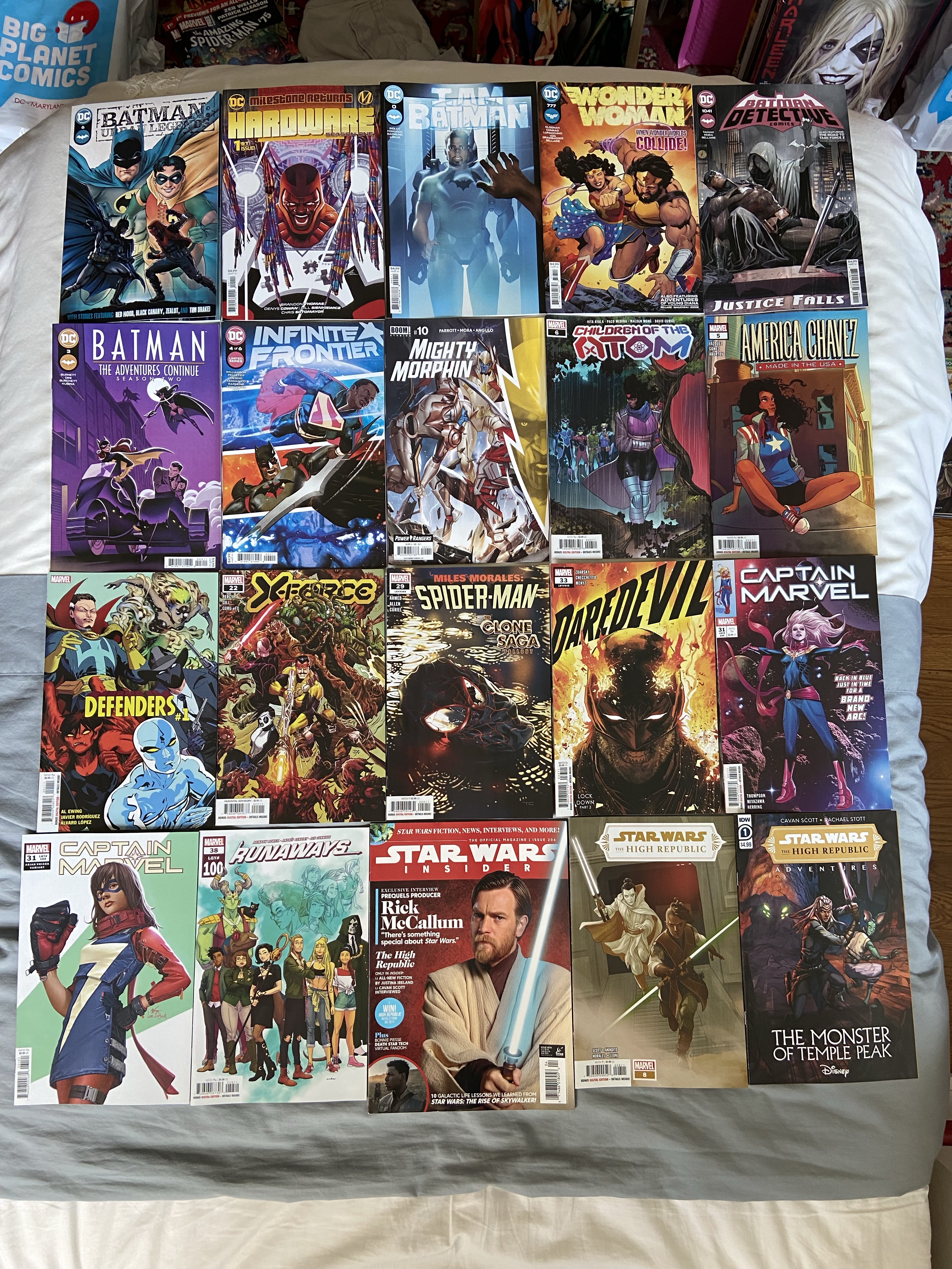 Milestone’s third returning tile was Hardware, Spinning out of Future State we got I Am Batman where Jace Fox took up the mantle while Bruce was “away” during some of Fear State, Diana was on the earth where genders were swapped and her alternate self was a villain of a man, Worth teamed up with a lot of villains to get revenge on Batman and he beginnings of Task Force Z were being noticed, Flashpoint Batman met President Superman, the final issue of COTA dropped with one of the members having been revealed as an actual mutant and invited the the Hellfire Gala, this America Chavez run was at its end with her having learned the truth about herself, a new version of the Defenders started (this team of Defenders is more of a cosmic version, not unlike the cosmic oriented version of the ultimates, this team with be thrown back into each of the previous Cosmos’, i.e. like Eternity is the modern Cosmos of the Marvel universe, to find their villain. You know I love cosmic Marvel, so this was another fave title for me), Miles had a lot to think about after his Clone Saga, Electra (and others) couldn’t figure out where Bullseye was since his attacks were happening in multiple places at once, and Matt was exposed to a drug that made him more aggressive, Carol and Rhodey went on vacation (and this issue got an In-Hyuk Lee AAPI Heritage cover), Runaways ended this run with its 100th issue (Gert saw Gert, some Majesdanians arrived to take Karolina, and the last couple pages hinted at things), the High Republic got a new title, and we got the next issue of SWI.