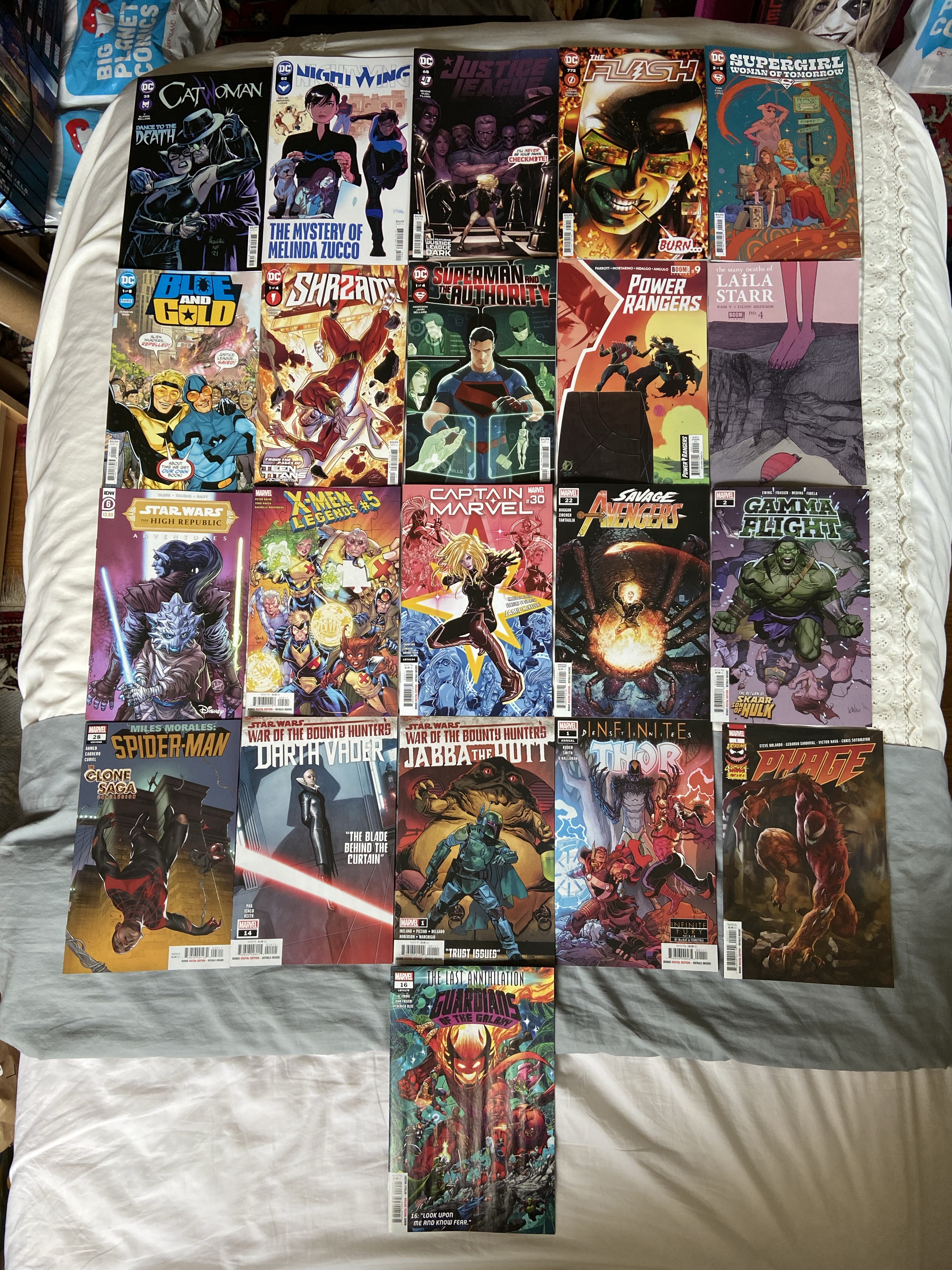 Selina met Father Valley finally, Nightwing learned who Melinda Zucco was, tensions were rising in JL as Checkmate snuck into the HOJ, Wally was back with his newly rediscovered kids and things were getting back to normal (normal for a Flash at least), Booster Gold and the original Blue Beetle got a miniseries, shazam got a microseries (I’m calling a 4 issue series this just for clarity, I’m not sure if there’s a name for that already) that spun out of TT Academy, Superman and The Authority had begun (Clark had decided to give the Superman mantle to Jon since his powers were waning and he and a group of metas were poised to head to Warworld to free it from Mongol, well the new Mongol. This microserises was about him choosing that team), Laila Starr’s next issue dropped, this run of Captain Marvel got to its 30th issue so they made is extra long, Miles’ Clone Saga ended with a new friend gained, WOTBH continued, Thor got an Infinite Destinies issue, Phage was the next Extreme Carnage issue, and we entered the Last Annihilation in Guardians 16 where Dormammu wanted space as his next domain.