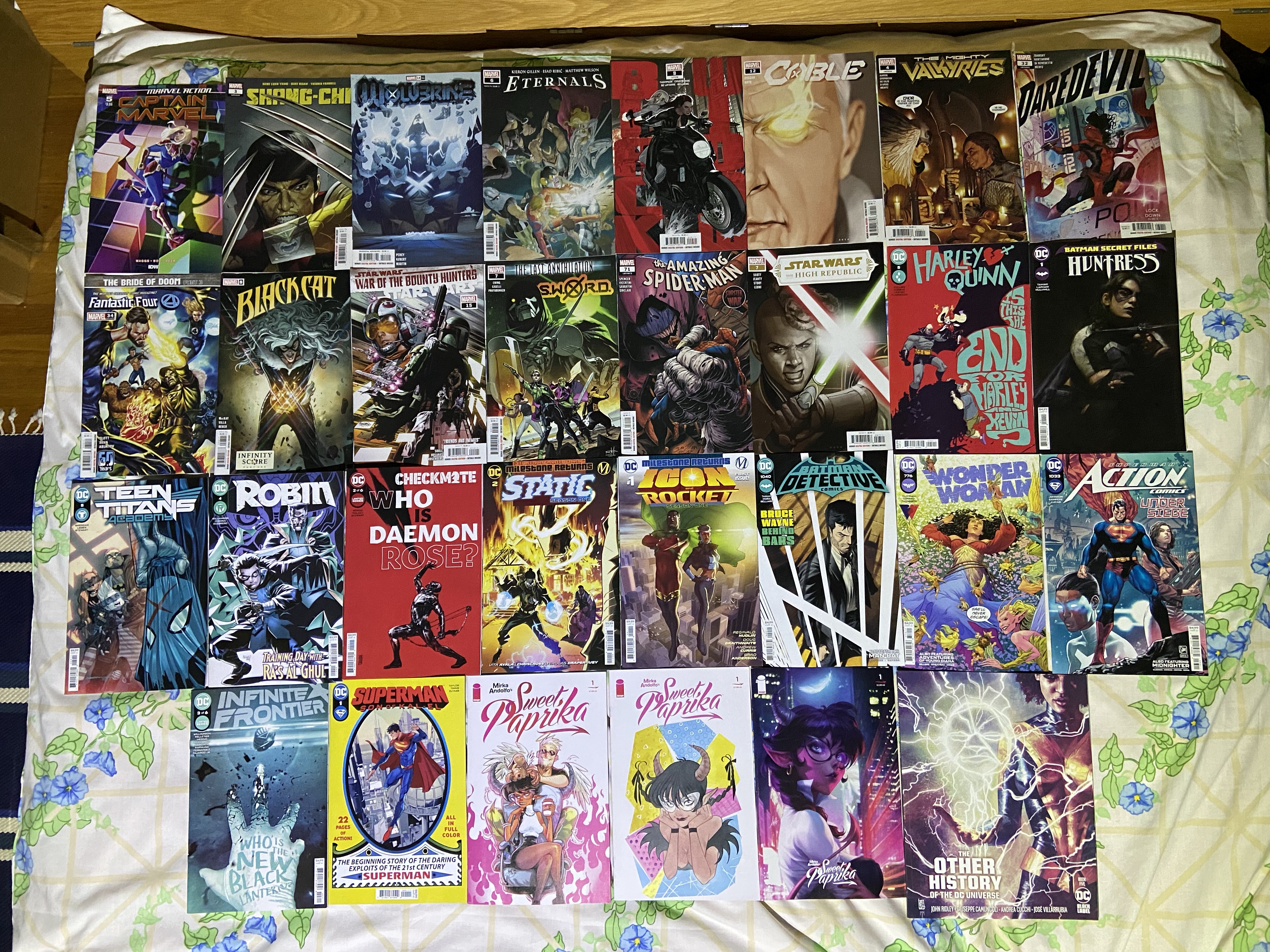 Logan was the next on the list of heroes to clash with Shang-Chi, Logan was tracking Solem…or maybe he being tracked, Thanos was still making moves against the Eternals, Cable ended this run at issue 12 where the young Cable decided to return to his time, Rūna and Jane were unraveling things while Karnilla was creating life in Hel, Bullseye had taken NYC hostage as he started sniping people at random, and with Matt in prison, Electra had to deal with him (while all the heroes of NYC fail to find or stop him), Johnny did a very bad thing that caused Doom to forever (and continues to do so) change him in the Bride of Doom conclusion, Infinity Score started for Felicia as she was hired to steal the infinity gems which were people (this was happening alongside Infinite Destinies. Both event series ended with that Giant-size Black Cat: infinity Score that dropped before this), Last Annihilation continued with Doom helping out S.W.O.R.D., Sinister War continued with The Sinister Six and The Syndicate going after Spidey but Kindred is also around, Harley was freeing people from Hugo’s clutches, Huntress got a BSF special, Damian left the island for a bit and found Ra’s, who decided to help him a bit, Milestone debuted the new run for icon & Rocket, Kirk Langstrom was killed, Diana was still having Roman god problems, Clark had to stop world war fro breaking out over this Warworld tech, and Lois was in unexpected danger, a new Black Lantern appeared, Jon truly became Superman as he got his own title: Superman: Son of Kal-El, Sweet Paprika debuted, and Thunder was the focus of the final issue of DC’s Other History series.