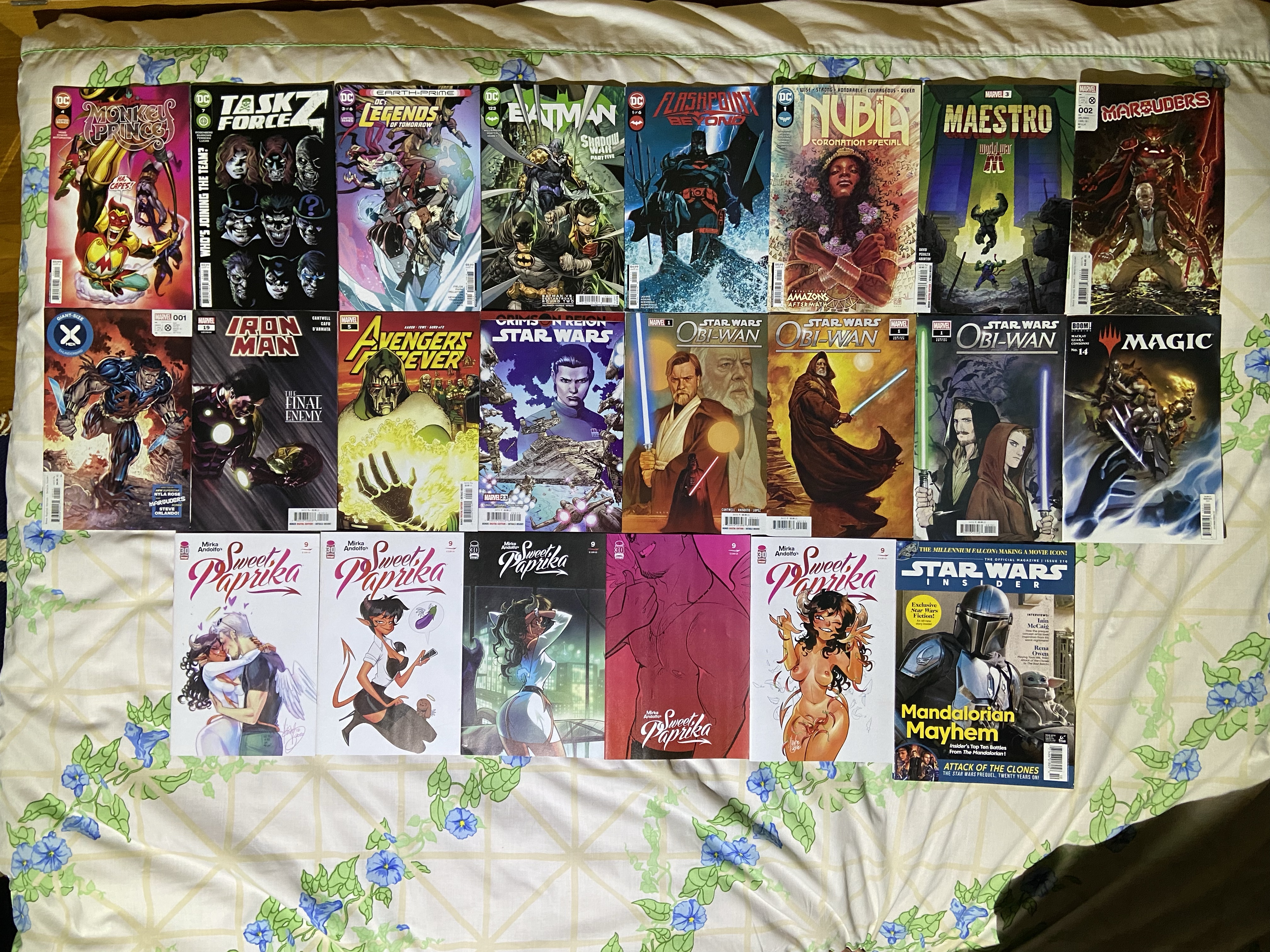 Last week’s issues. Getting the Legends of Tomorrow issue of Earth-Prime is bittersweet with the cancellation of the show. The next part of the Shadow War event dropped. Flashpoint Beyond started. And the aftermath of the Trial of the Amazons started with the official coronation of Nubia. I got that Marauders issue because of the Eric, The Red cover. Thunderbird got a Giant-size special. The Crimson Reign arc of Star Wars ended. We finally got the Obi-Wan Kenobi comic (for Star Wars Day)! Though it’s funny, that second cover (the Gist variant) is art that I’ve seen before, in 2018 I saved a promo image of that cover that I guess they never used for what it was supposed to be for, though I have a feeling this series was supposed to come out back then and they decided to wait till it coincided with the Disney+ series coming out. The Peach Momoko variant is also lovely, and I have the David Nakayama variant pre-ordered.