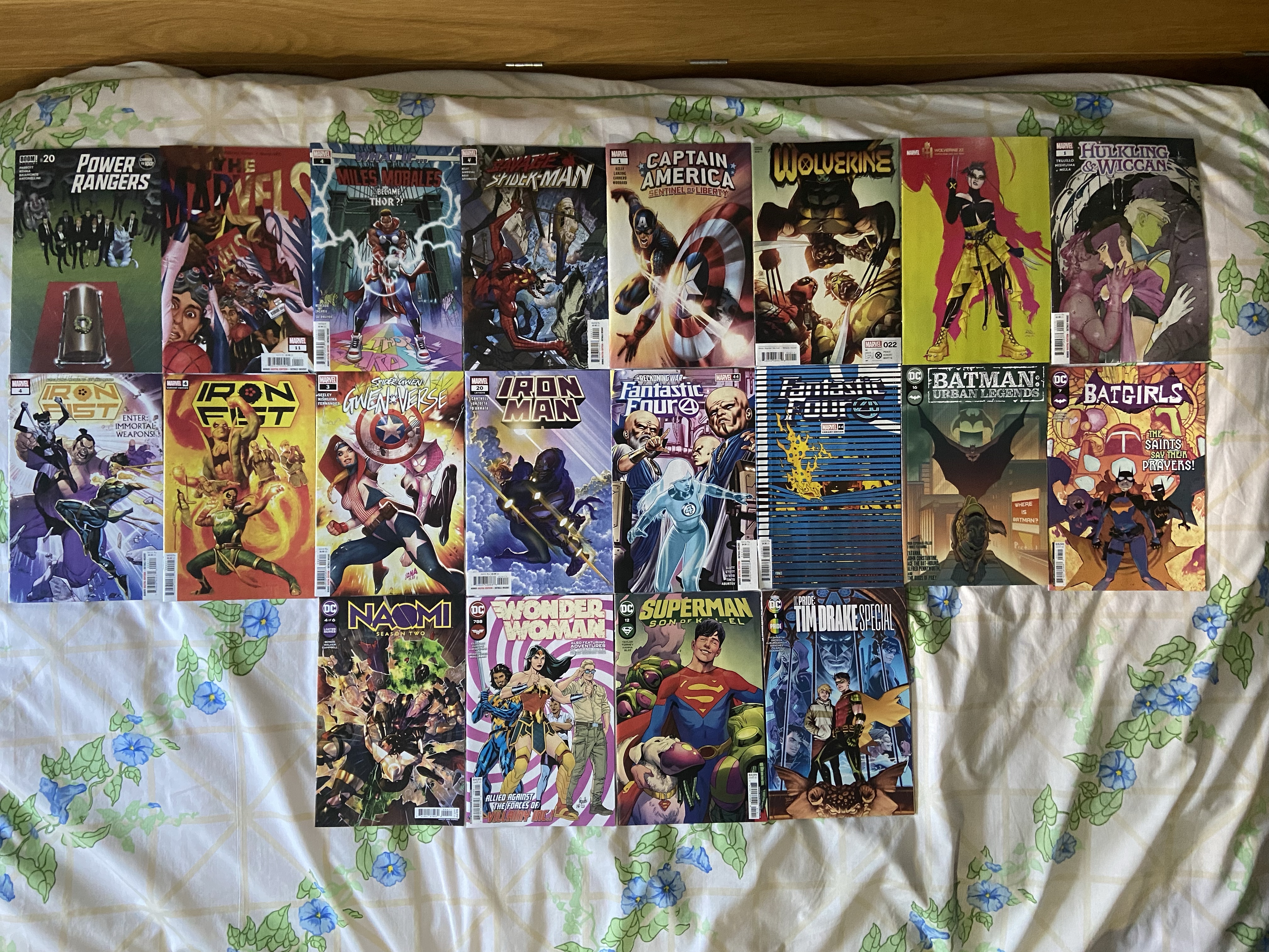 Since I’m so utterly behind in all the Power Ranger titles I have no idea who died. Issue 11 is the penultimate issue of The Marvels. This Captain America title I’m not quite sure about since I’m not sure if it’s a 616 story or a standalone title, but we’ll see. Looking forward to all the drama happening in Wolverine. I’m excited for the Hulkling and Wiccan special! And even though I haven’t yet read the Fraction run of Iron Fist, I’m looking forward to these two Immortal Weapons paying a visit to the new Iron Fist. Intrigued by the Miles and Gwen multiverse stories continuing. Tony and Patsy having something big happening soon. Of course the Reckoning War still rages. General stuff happening in DC issues. It was nice that they gave Tim Drake a Pride special, I’m excited for that.