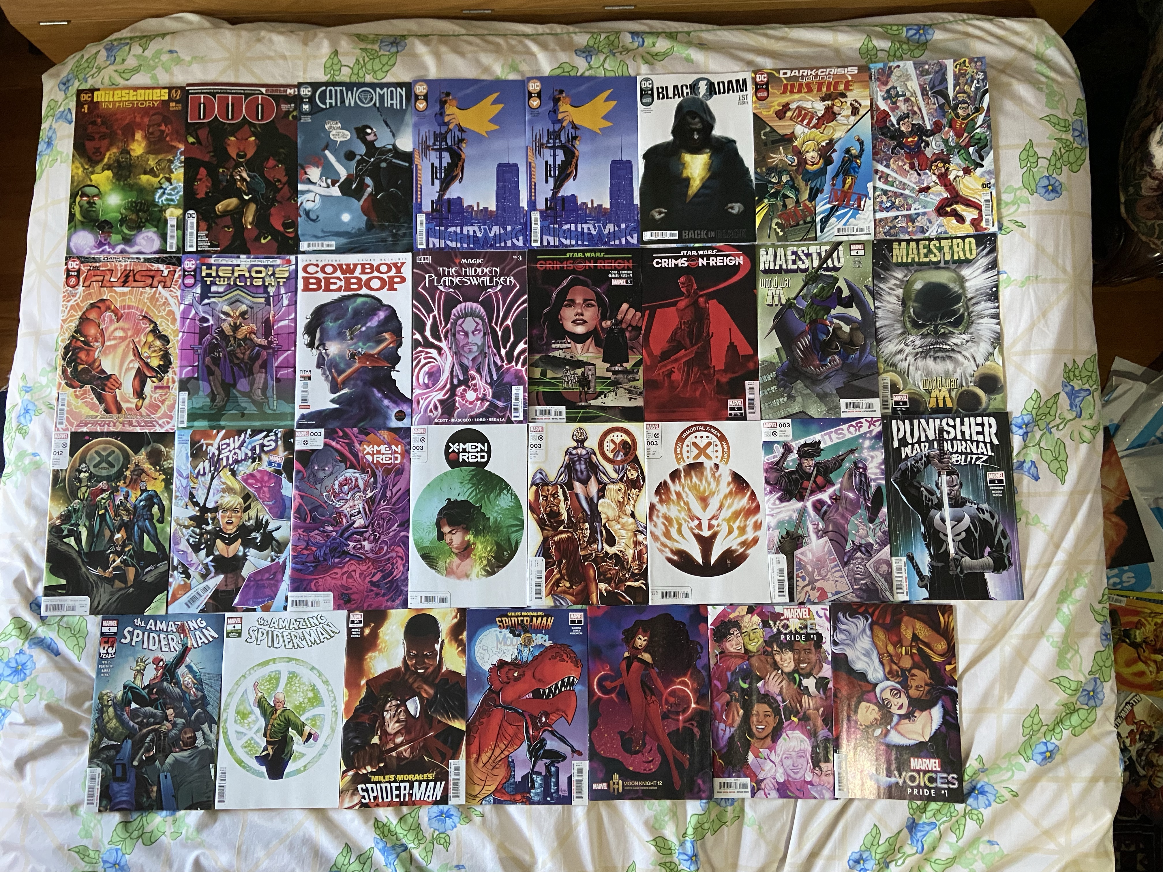I don’t know a lot about Milestone beyond what I knew from the Static Shock animated series and various characters that I now know were of this brand, so the Milestones in History title seemed like a good way to help with that beyond eventually getting to the Milestone Omnibus I got a few months ago. Duo’s first issue caught my interest, so we’ll see where that goes. Black Adam got a maxiseries, though I’m not sure whether it’s in the main DC continuity or just it’s own thing. It’s not a Black Label series, so I feel like it could be canon? Again, I’ll see. Dark Crisis continues with a couple tie-ins from Young Justice and Flash. The CW Berlantiverse/Arrowverse crossover event has it’s final issue here. I have enjoyed this event, it helped with all the cancelled shows this season. And I am wondering what connections there will be to this in Flash season 9 when we get it. Crimson Reign continues. There is a lot going on in all the X-titles. Punisher gets a one issue homage to the original War Journal I think. Miles is learning more about this other world and things just aren’t good. Though this Moon Girl and Miles special is the first in various team-up titles coming at us this summer, so at least there are some fun things going on for Miles (whenever this takes place in relation to his current story). Though Kamala is getting a few team-ups, that has me ecstatic! And we got the Marvel Vices Pride special too, can’t wait to get to that!