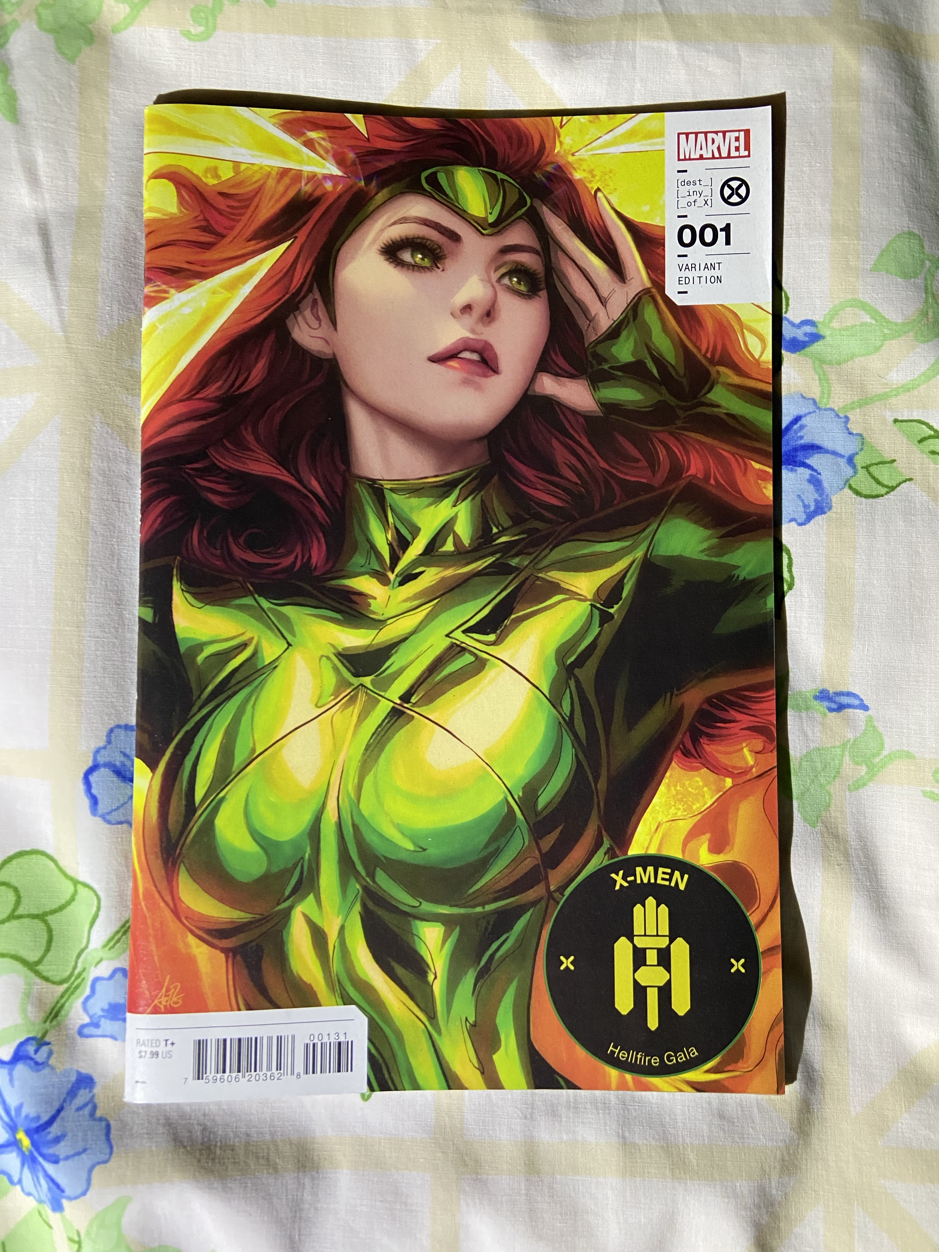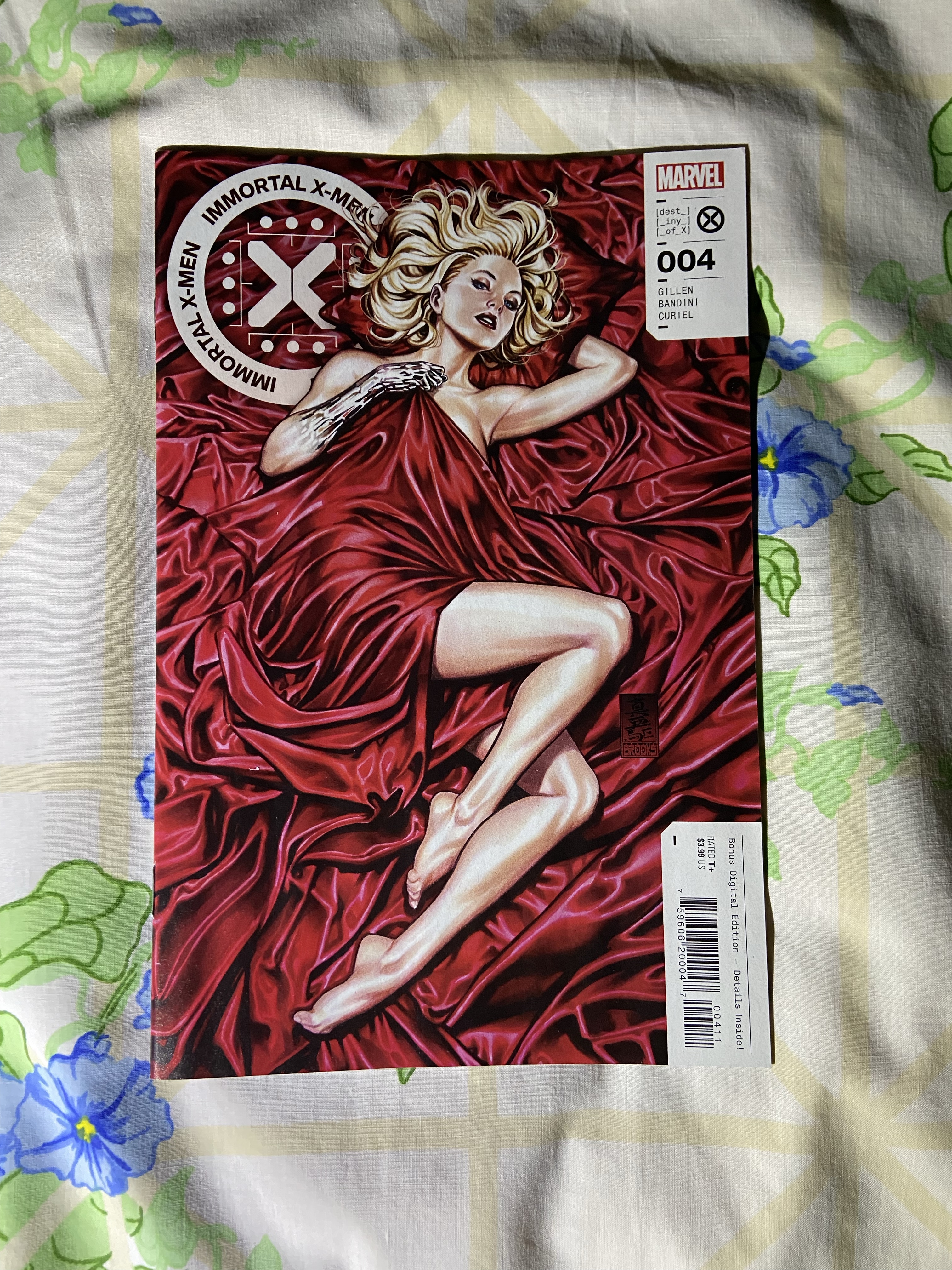 I just love this cover, and not just for Emma Frost being there as she is. Mainly I like it for the shades of red. I just love the way it’s being drawn and colored. I also saw the other variants of this cover with different colors at SDCC from the artist himself, and would have gotten them all if I could have. I think they were pink, blue, black and white sheets respectively.