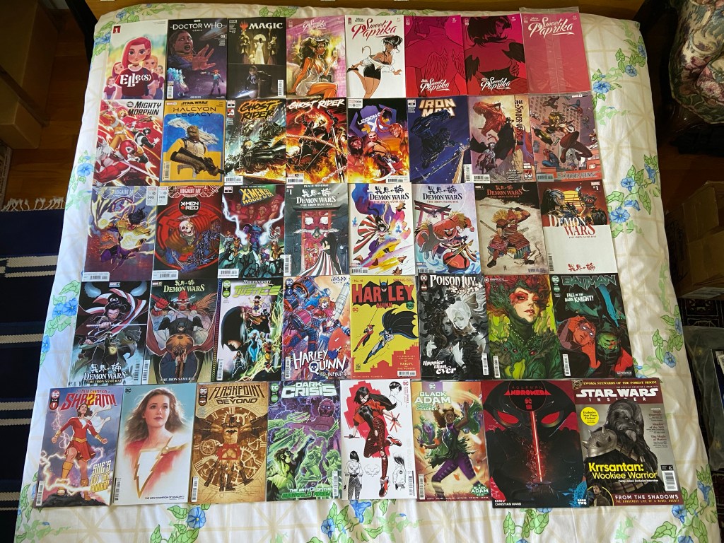 So many comics! I had to completely clear the bed to get them all in the photo. This was because there were so many variants that week.