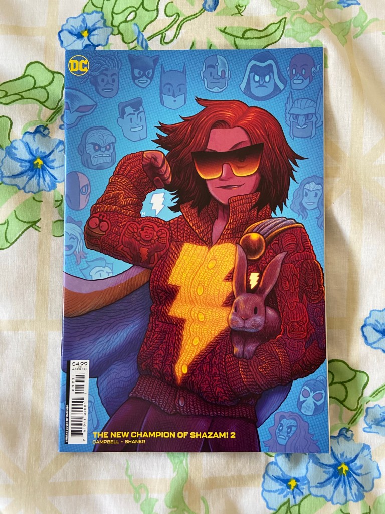 As I’ve mentioned before, I enjoy collage covers, and this was a very well-done covers using the sweater as a canvas showing various characters and the word Shazam. Also the cartoon style of the background heads was fun.