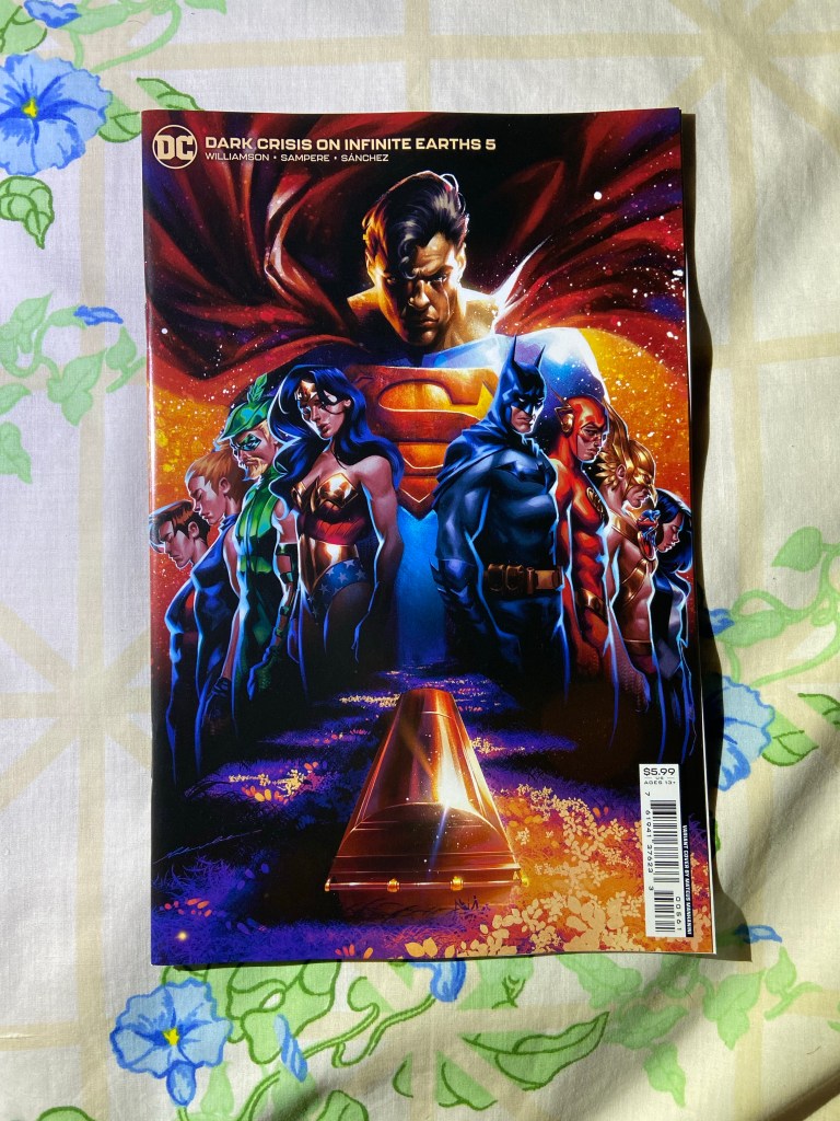 This variant is an homage cover to the classic Identity Crisis event where the beloved wife of a hero was murdered and the mini event was a murder mystery. It’s quite a good read.