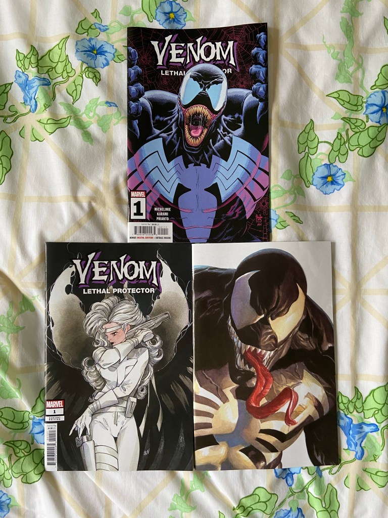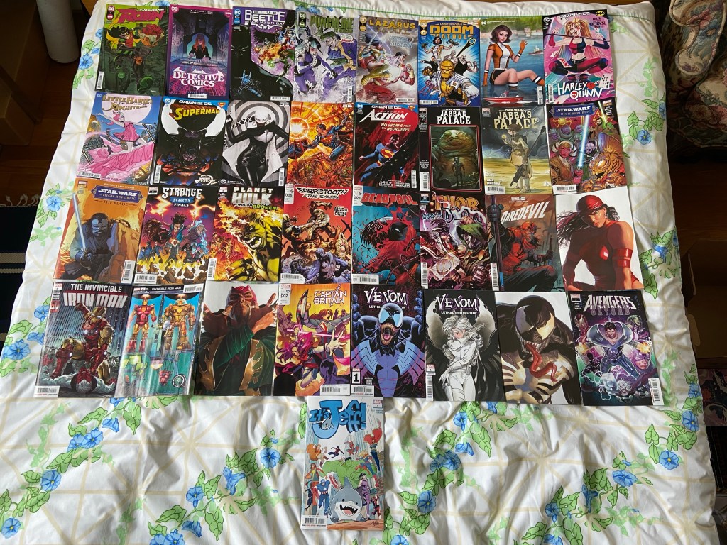I’m wondering what the next arc of Time Drake is going to be. I also wonder if the story in the Blue Beetle miniseries is at all similar to the upcoming movie (the trailer of which is dropping tomorrow, April 3). This is the final issue of this Punchline title. And we have a new Doom Patrol run that is part of the Dawn of DC era that’s starting (which I still can’t read till the end of next month because of the either very delayed Lazarus Plane tie-in’s or they just started the Dawn of DC issues to quickly). Also this issue of Harley is part of the Dawn of DC too, so I can’t get to that yet either. Then we have a Jabba’s Palace special, as it’s the 40th Anniversary of Return of the Jedi this year, we’re getting some one-shot specials. Strange Academy’s next issue is close to the end and I still have to catch up with the previous run. Sabretooth is having problems with himselves. I’m still loving this Thor arc, same with this Daredevil arc. Tony is just having all the problems, as usual. Venom got another Lethal Protector sequel arc to the last revival of the Lethal Protector miniseries. The All-Out Avengers title switched to Avengers Beyond to continue the story. And Jeff, the land-shark got a one-shot special that I can’t wait to get to!