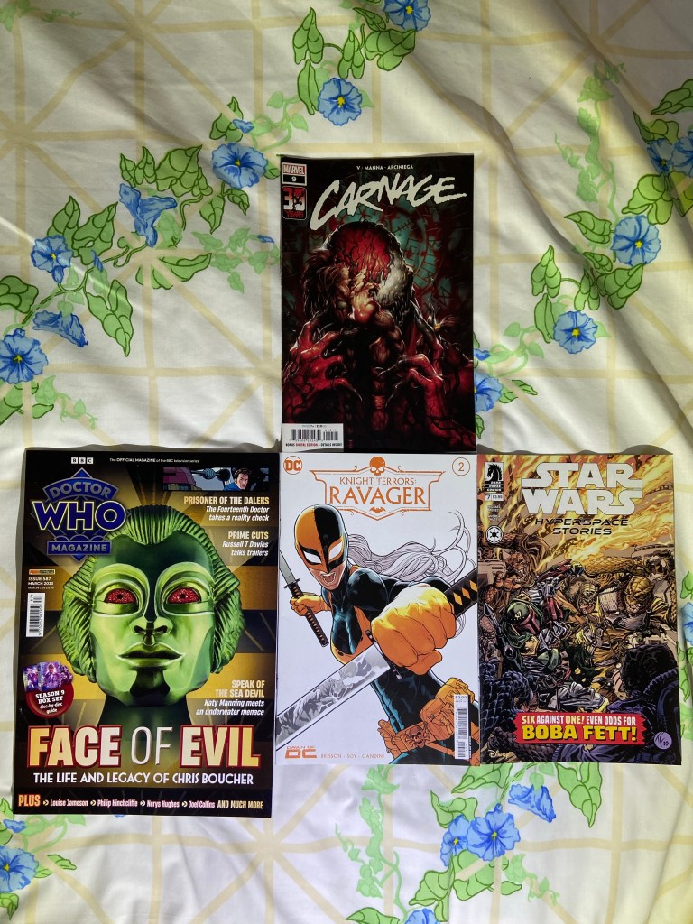 The Hyperspace Stories issue is a couple weeks late. The ravager issue is from the same week but I just forgot to pick up two copies. The DWM issue is just the one I picked up from my box (from March). But, oh my Knull, the Carnage 9 issue is from JANUARY!!! I’m not sure why the main cover was delayed for so long.