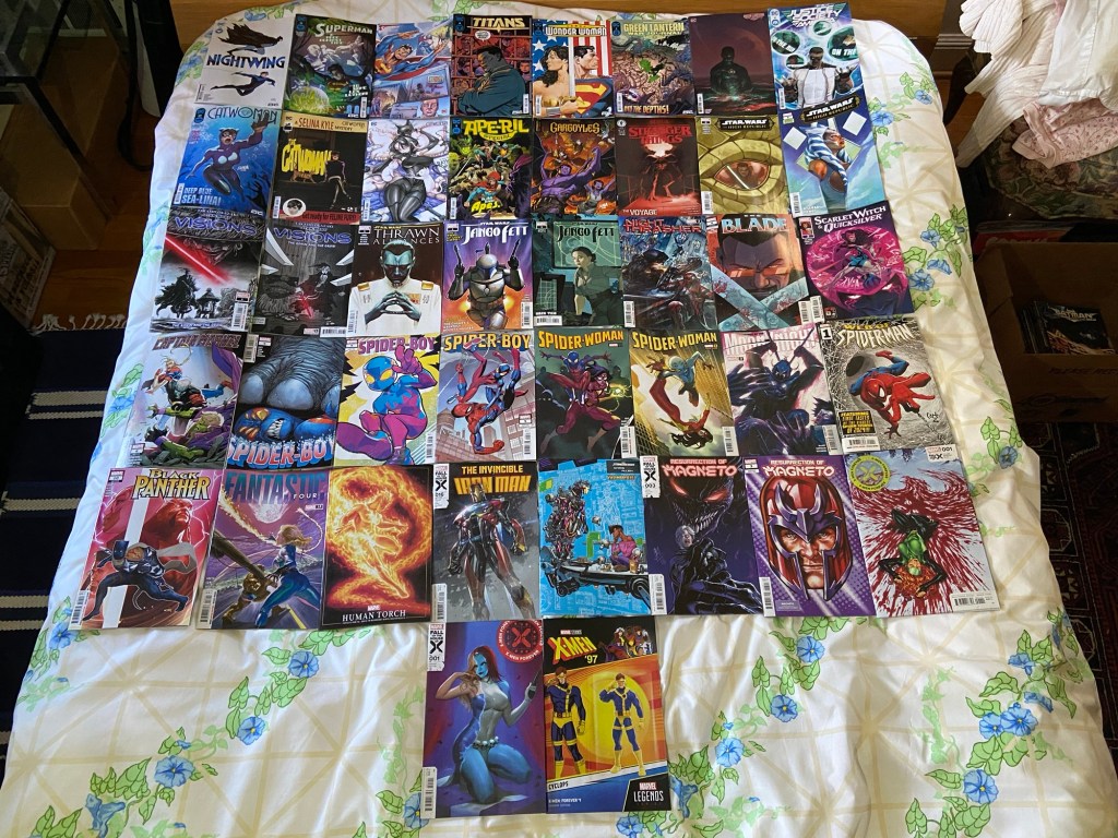 This Nightwing issue is the one before the big milestone issue. I’m excited about the Superman story. Titans having Waller on the cover is worrying, haha. I wonder why Mr. Terrific is on the JSA cover. Curious about the Catwoman arc. We got a Spring special from DC. The final version of Stranger Things The Voyage. The Star Wars Visions comic finally came out. Jango Fett got a miniseries. I’m excited to see Spider-Boy popping up in a couple Spider-titles. We got a Spider-Man special hinting at things to come. I wonder what’s going on on that Magneto cover. And I mean look at that X-Men Forever cover!