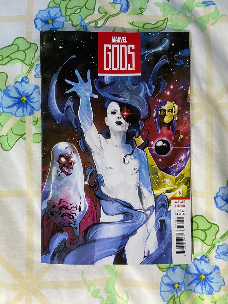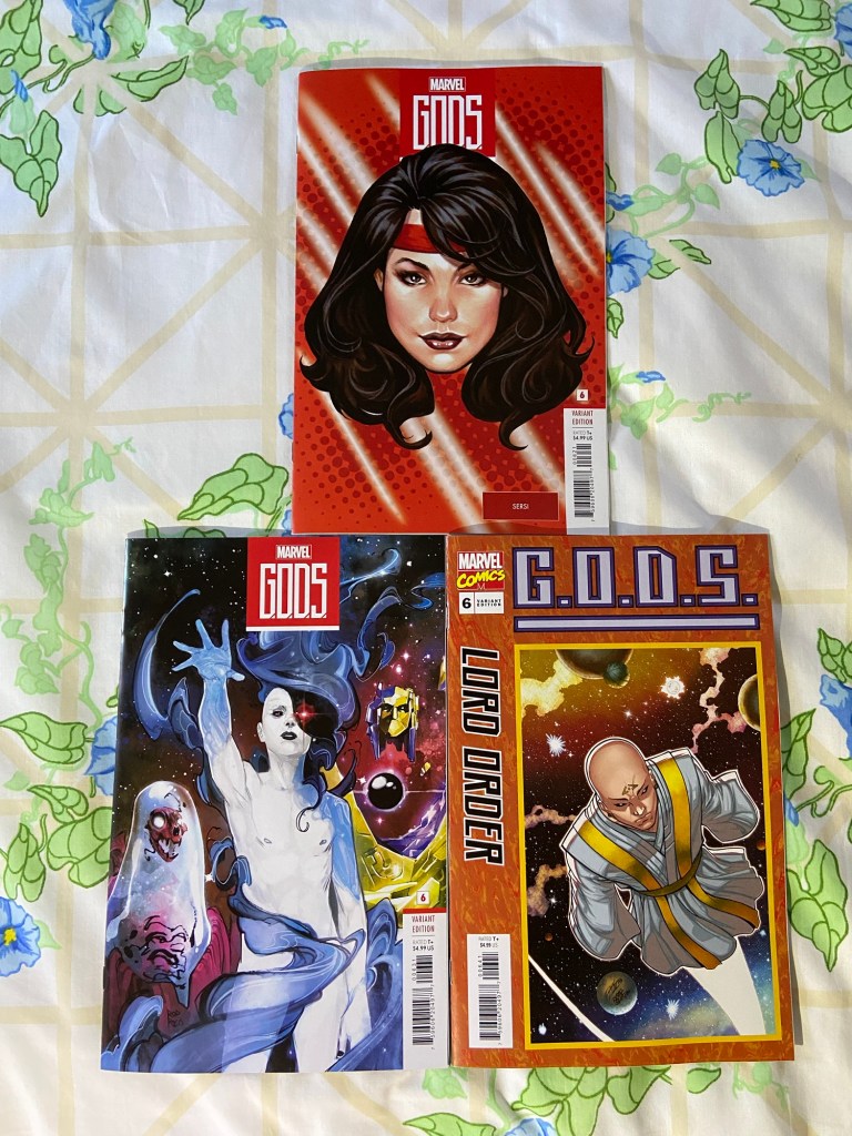 Every time I see this headshot cover, literally every time, I think it’s Electra even though I know it’s Sersi. I hadn’t gotten all these covers of the new versions of the cosmic entities, but I had to once I realized what they were doing. And that last cover is just amazing, but mainly I got it because of the Living Tribunal on the right.