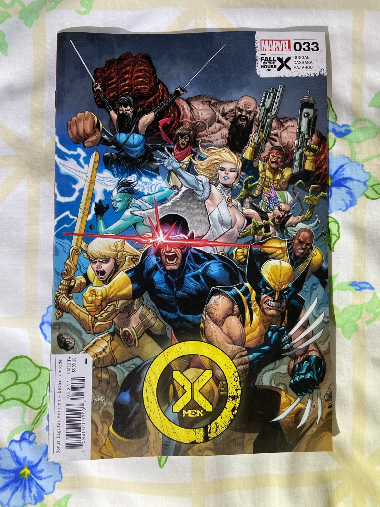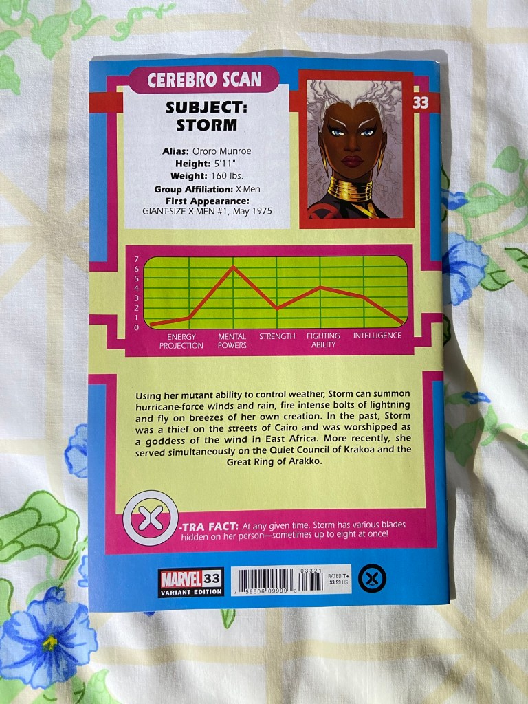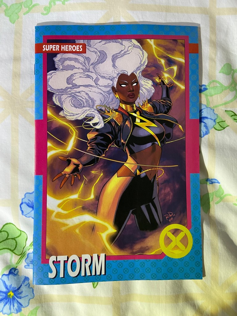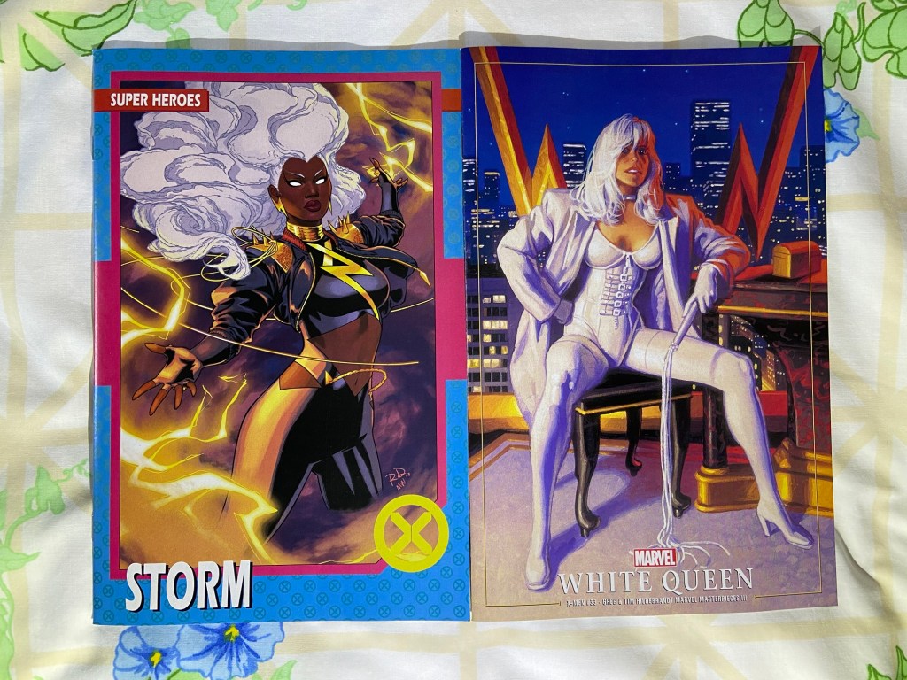 I forgot to take photos of these properly so the order is a bit weird. The main cover is here because Kamala is on it. The Storm trading card cover by Dauterman is here because that design for Storm has been great in the titles and he’s a great artist. And that Emma Frost one is one of the Hildebrandt covers which will have their own post when I have them all.