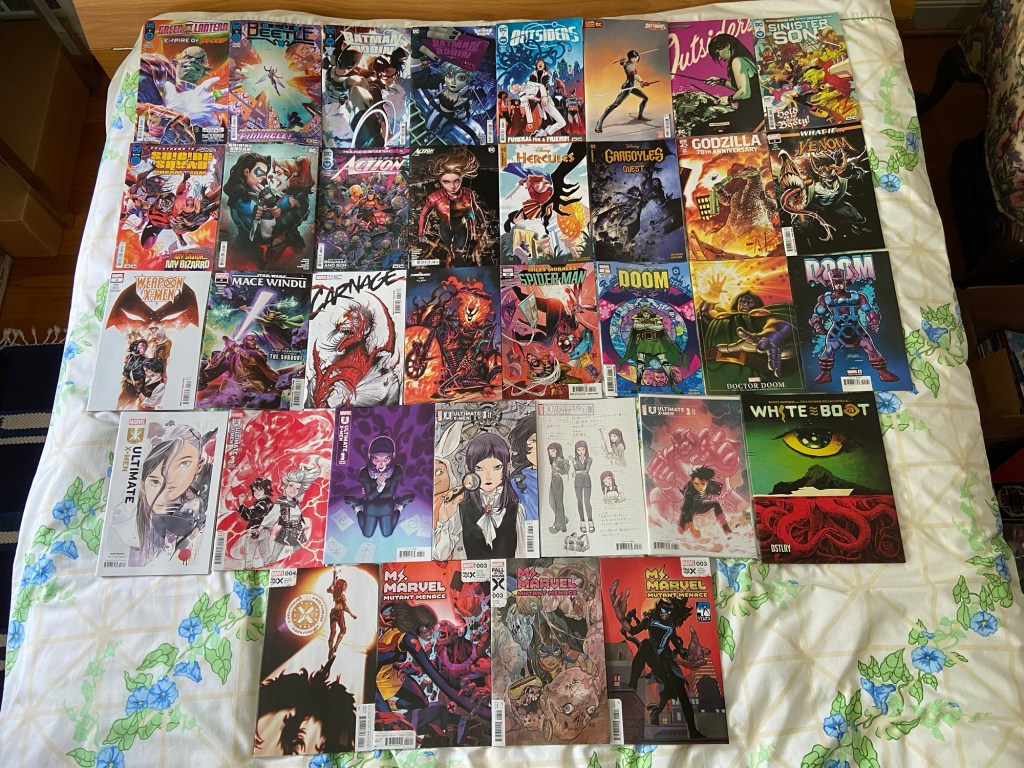 Outsiders seems like a stressful arc. Dreamer’s adventure continues in Dream Team. House of Brainiac continues. Godzilla got a 70th Anniversary special. Carnage looks trippy, as usual. Doctor Doom got a special, and I’m intrigued by it because I saw some pages that had cosmic entities on them. And as you know, I love those things haha. Ultimate X-Men continues. DSTRLY dropped White Boat, the plot of which intrigues me. And Ms. Marvel continues.