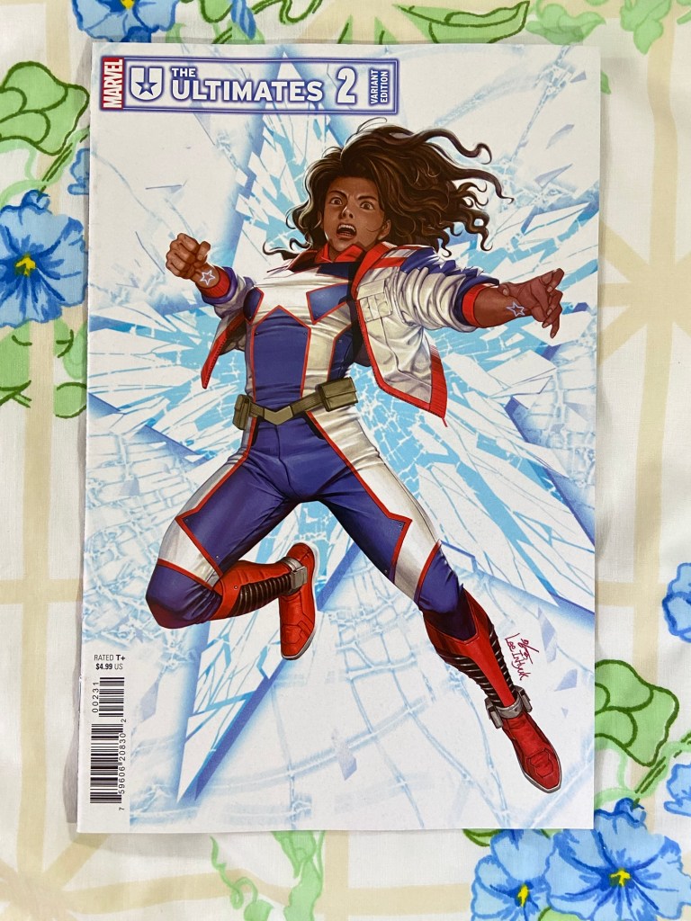 I liked the strangeness of this Outsiders cover. It’s been a while since I’ve bought an Ariel Colón variant. I liked this one. This variant for the TMNT issue shows all the main villains from the 2003 TMNT show (which is my favorite iteration of the turtles), plus that great logo on the back which I think all the variants have. America punches her way onto this cover for Ultimates 2. I’m not sure if an Ultimate version of her will show up in this issue, or if it’s just a fun way to pay homage to the team she was on from a few years ago, but I love it either way. Plus, InHyuk Lee did the cover.