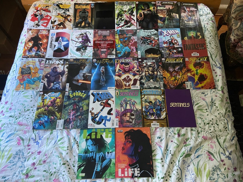 We got the beginning of DC’s Absolute universe (which people are comparing to Marvel’s Ultimate universe) with Absolute Batman’s run starting. We got a Green Lantern special. We got another new High Republic Adventures miniseries. Blade got a red band miniseries. The Ewoks got a special, and I feel like it could show how they got all those helmets. Venom War continues. Phoenix takes on Gorr! Man-Thing guests on X-Force. We got a Sentinels title in this new era. And we got the next issue of Life. There will be another post after this, I made one for all the posters because I got a lot of them.