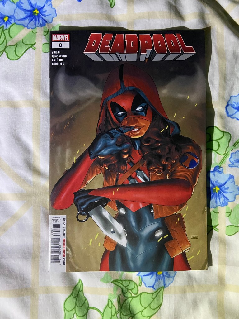 There were many variants of this cover and they are a mix between SFW and NSFW, but they were in blind-bags so you wouldn’t know which of the (I think 6 other) covers you could get. The variants look really cool too, the colors and such and other small details look great.