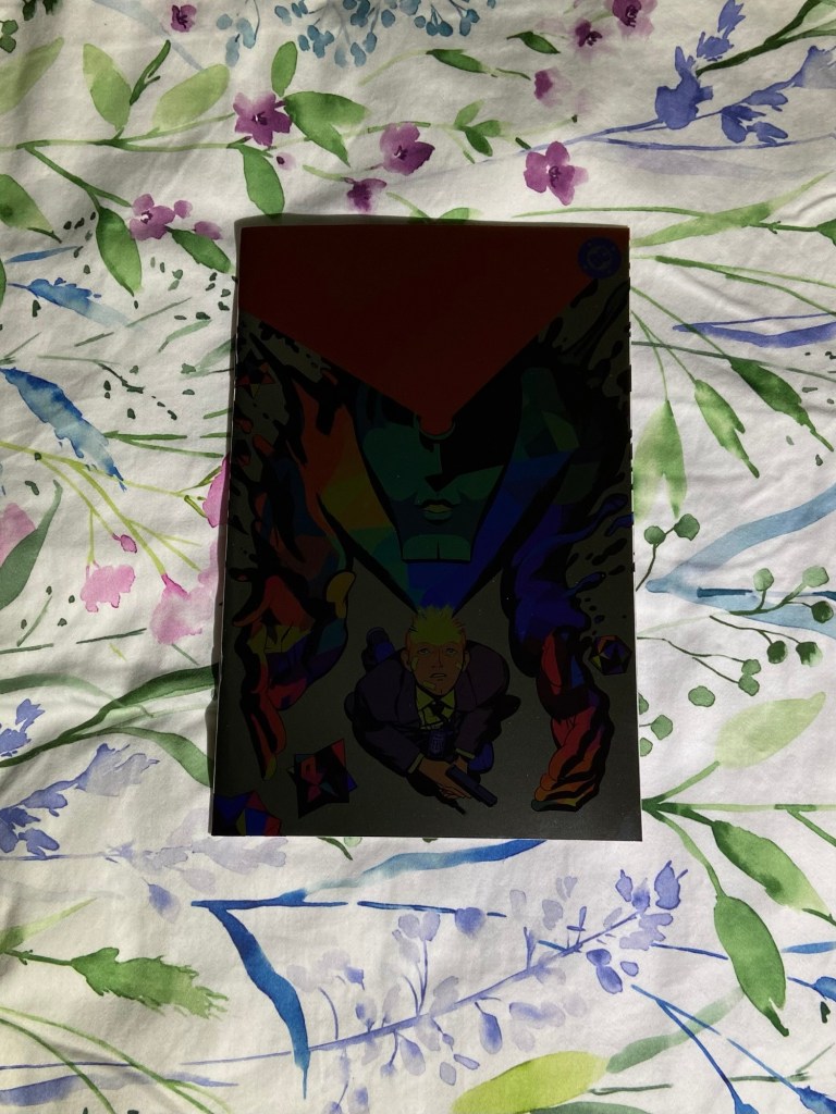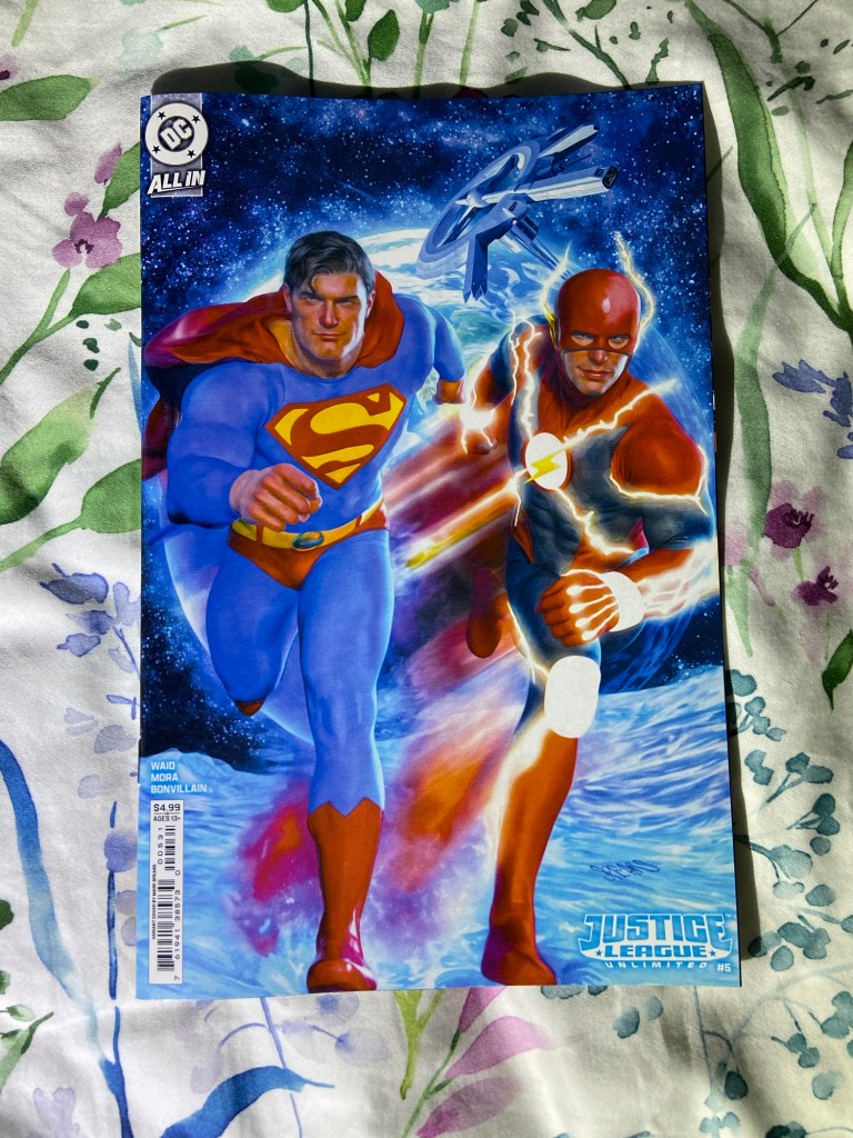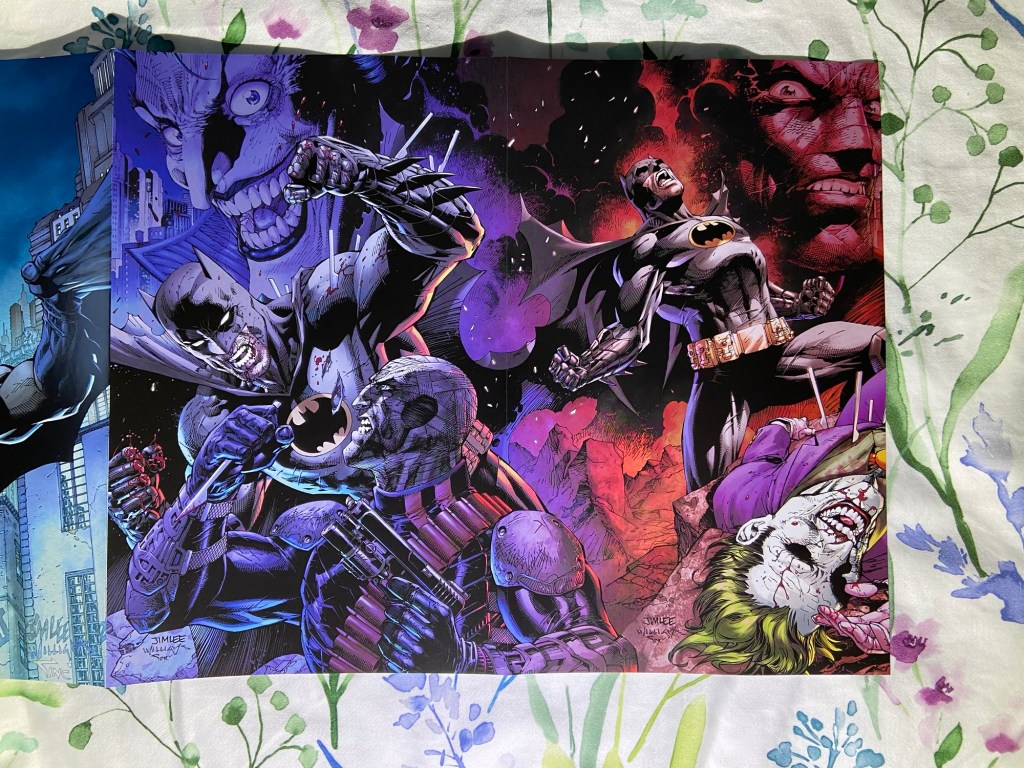 This cover is a wraparound but it’s weird because it’s only wraparound for the two inside parts. The main cover part is just a nighttime variant of the main cover of the book. I found that odd. But hey, it’s Jim Lee, it’s fine.