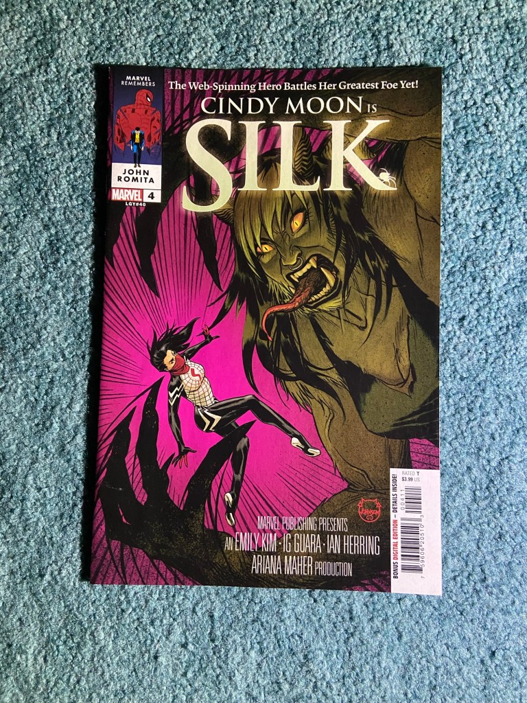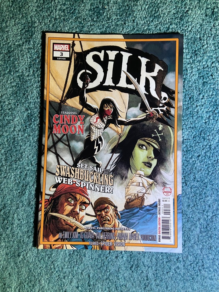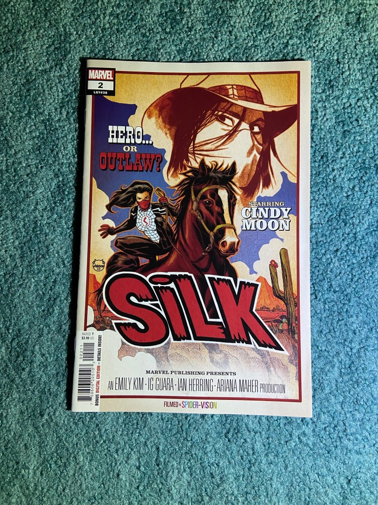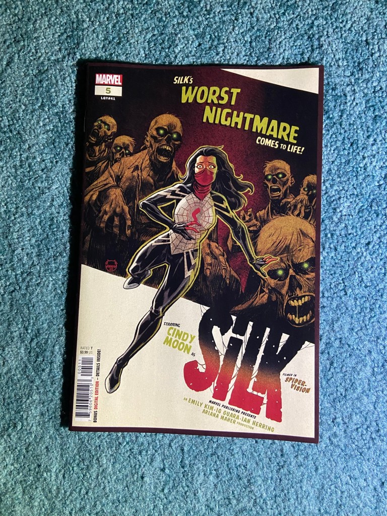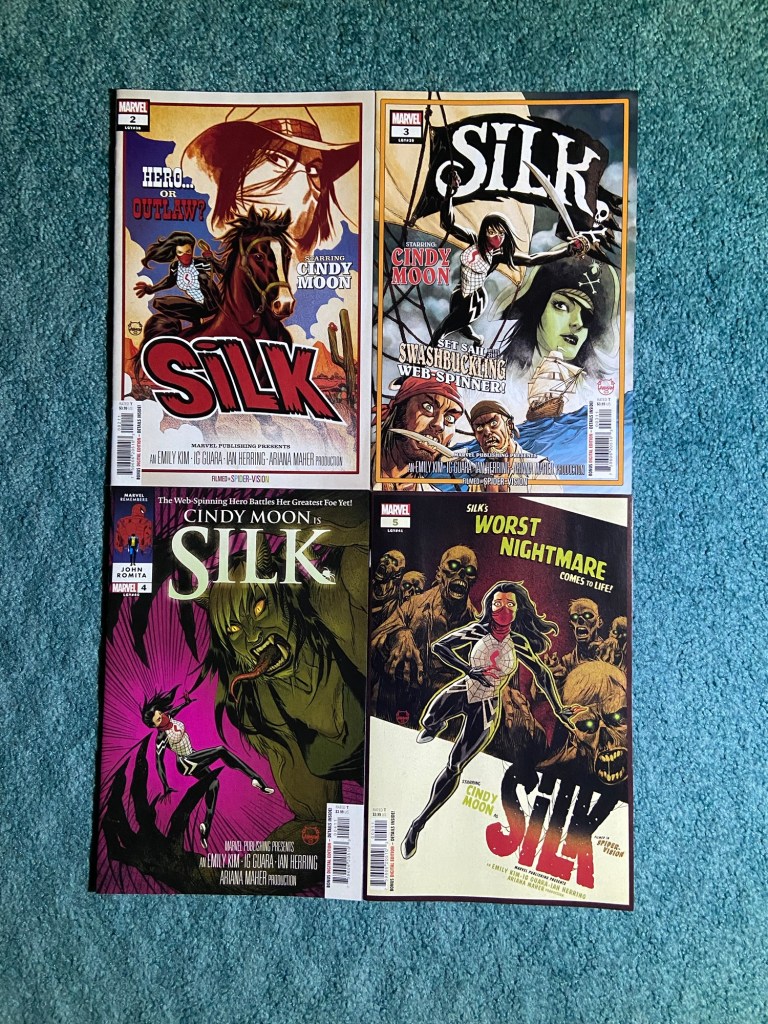 Speaking of movie poster covers, these Silk covers are fun! She’s trapped in dreams during this arc, those are the dreams.